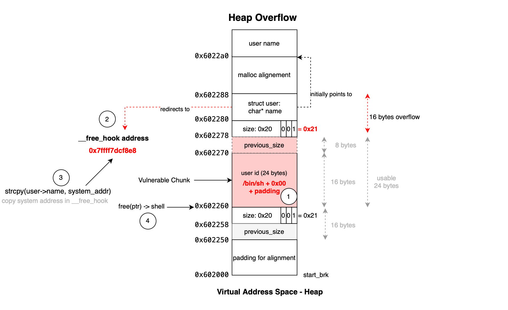 This allows the overflow to overwrite the pointer to point to __free_hook (pointer to function called whenever free() is invoked):