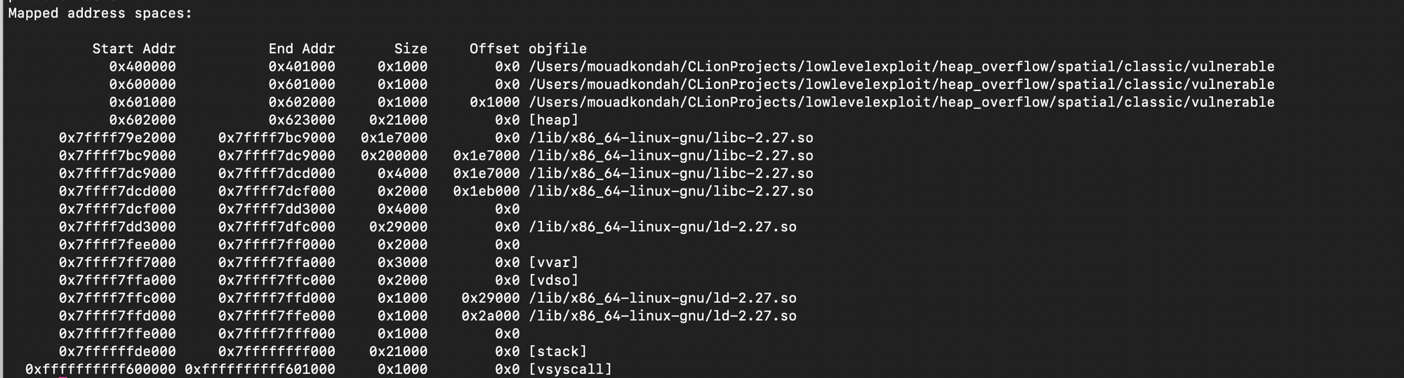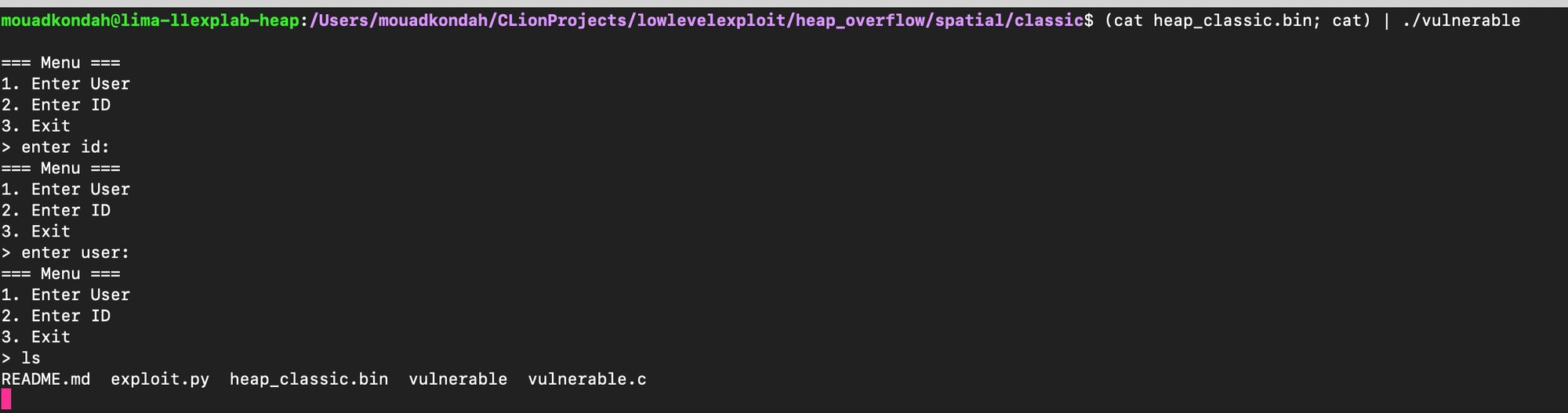 The example below demonstrates a naive heap overflow, where the chunk allocated for the provided id is smaller than the actual input. In this case, 40 bytes are read, causing a 16-byte overflow beyond the intended chunk boundary.