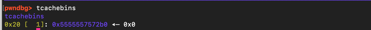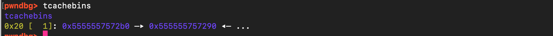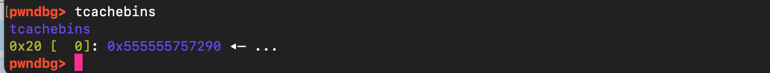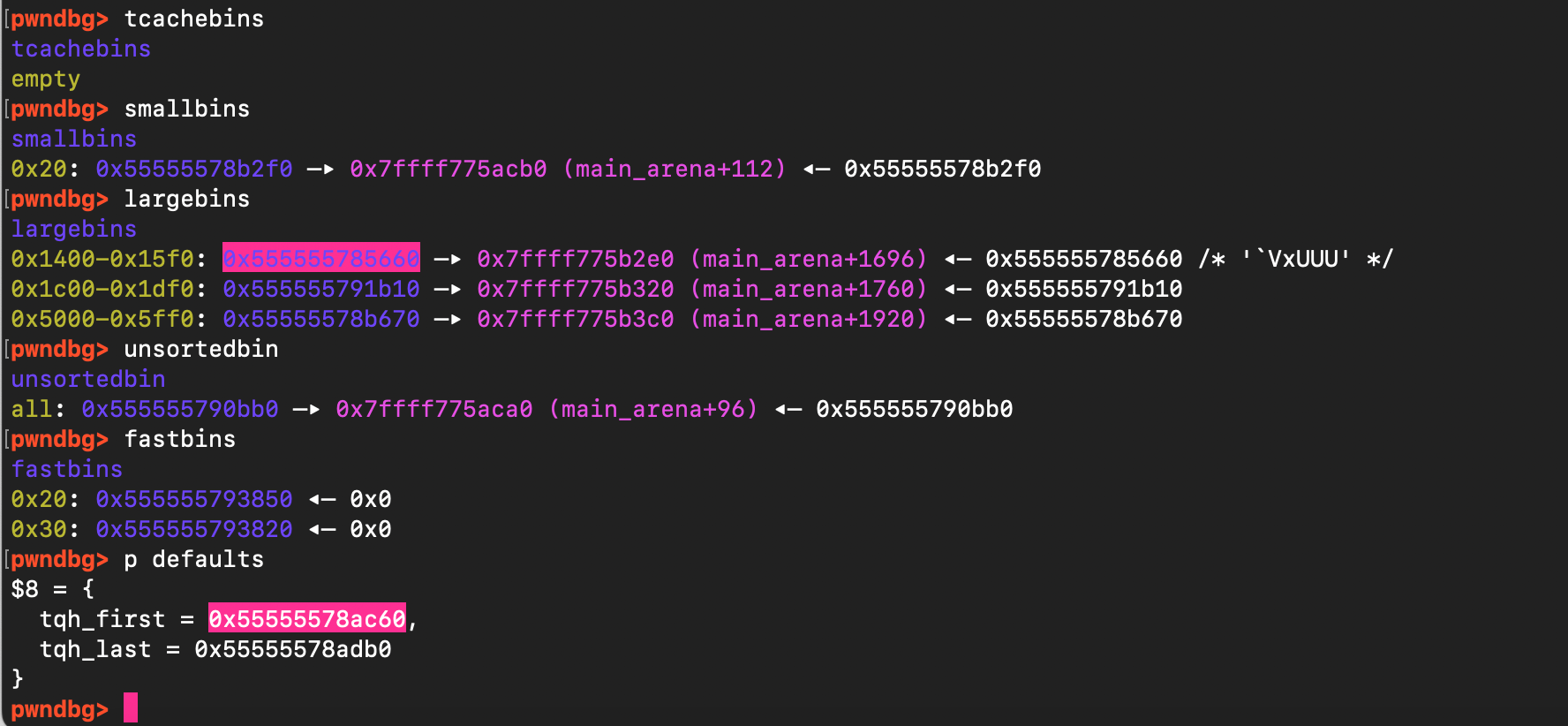 Let’s examine the current state of the heap , specifically which chunks are available by inspecting the different malloc indexes, including fast bins, large bins, and small bins. As shown below, as expected, the tcache bin is empty and there is a single chunk at address 0x555555785660, located just above the target defaults data structure, which can be used for the overflow.
