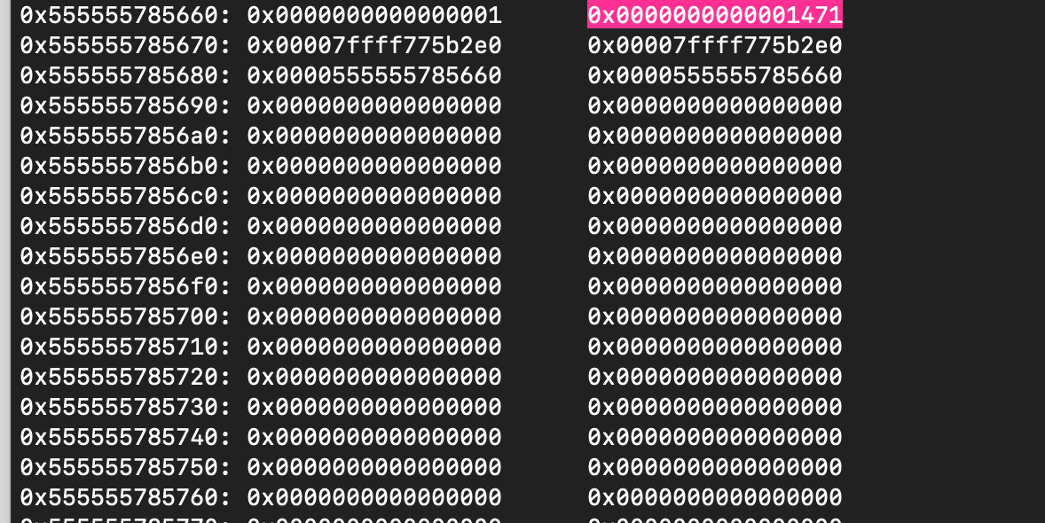 As shown below, the size of the malloc chunk is 0x1471 (5233 in decimal). Since we fully control the size of the arguments, we can force malloc to hand us this chunk.