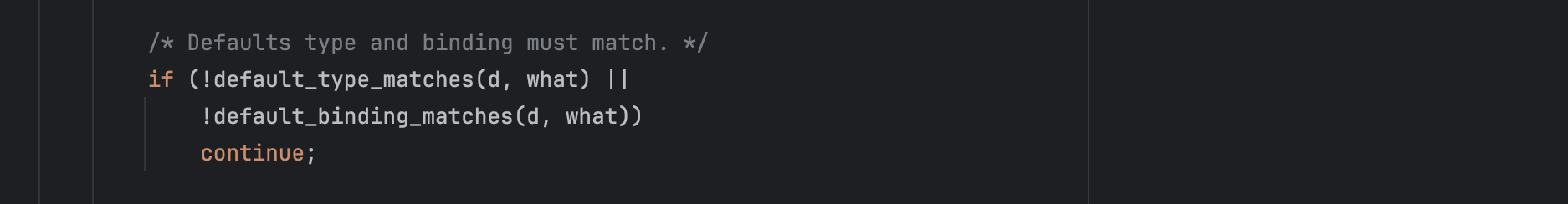 By using a crafted type = 269 and a fake binding in memory, we satisfy the condition needed to process the corrupted defaults entry while still forcing the warning path.