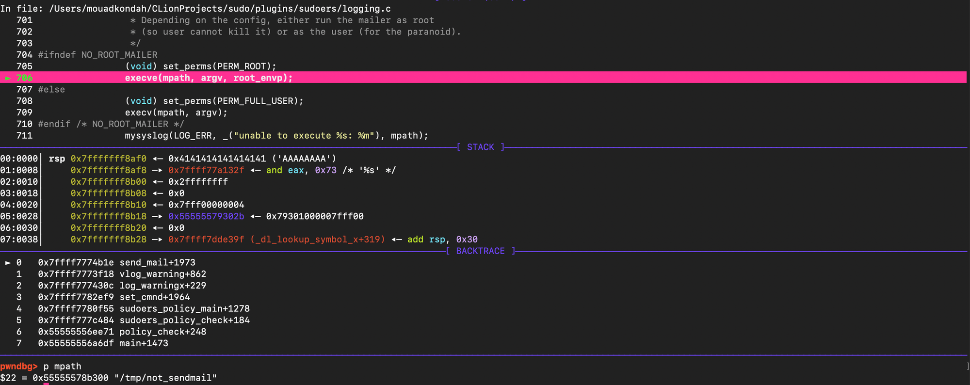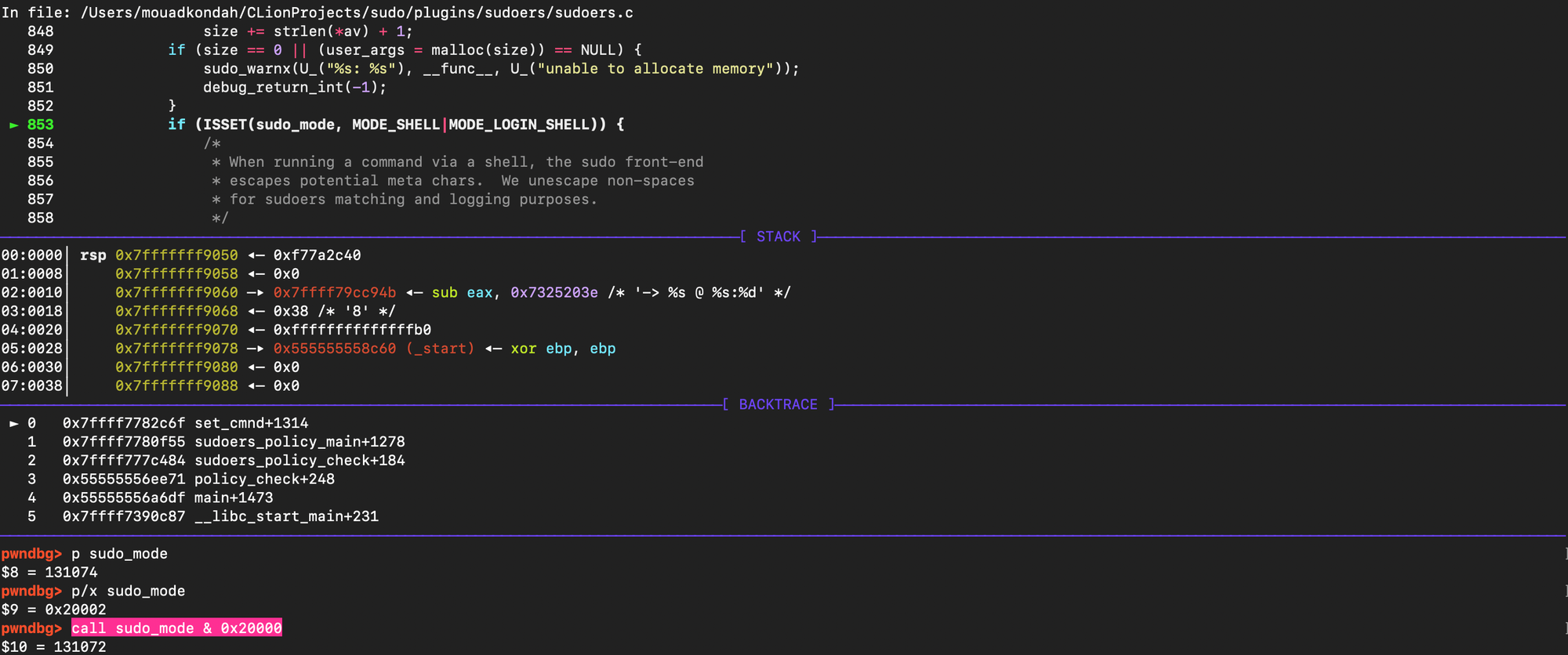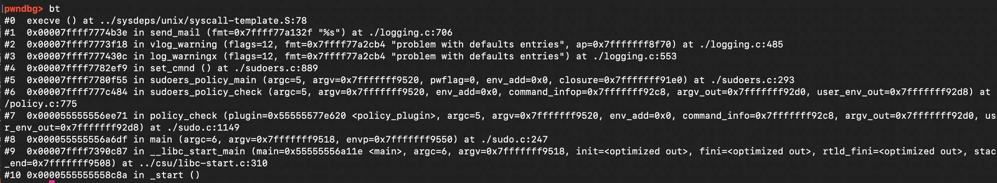 The sudo version I used in this post is 1.8.21, installed it with the following flags CFLAGS='-g -O0' ./configure --prefix=/tmp/sudo-debug --enable-static-sudoers.
