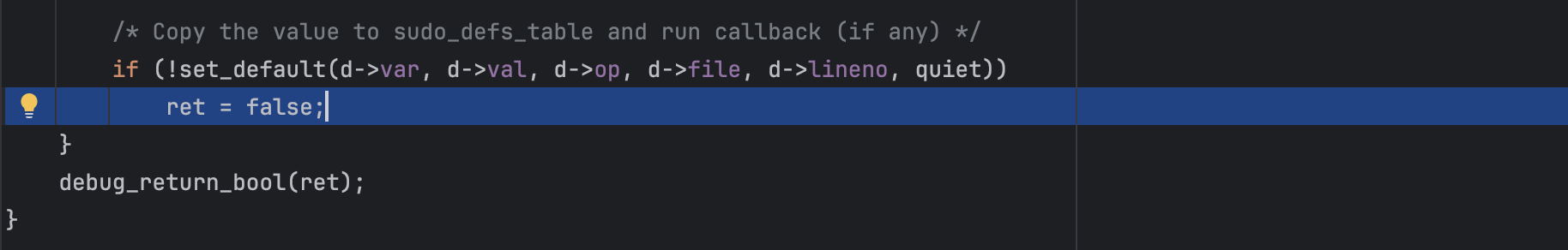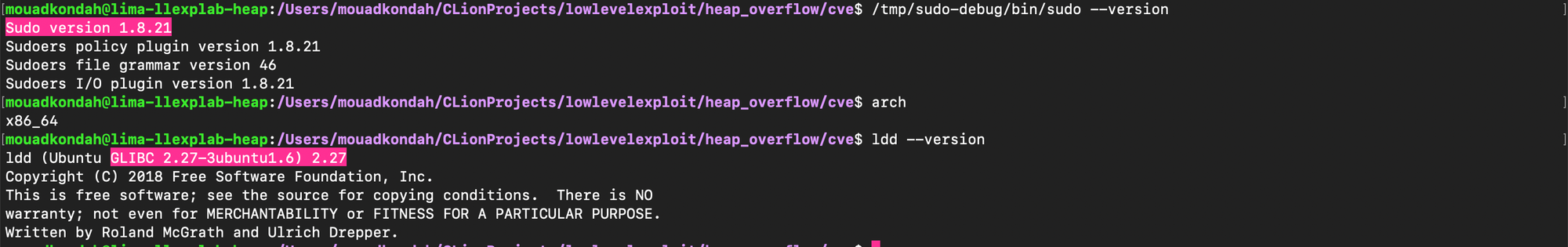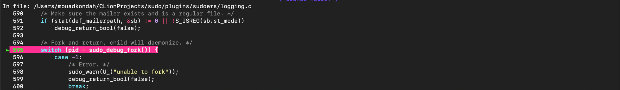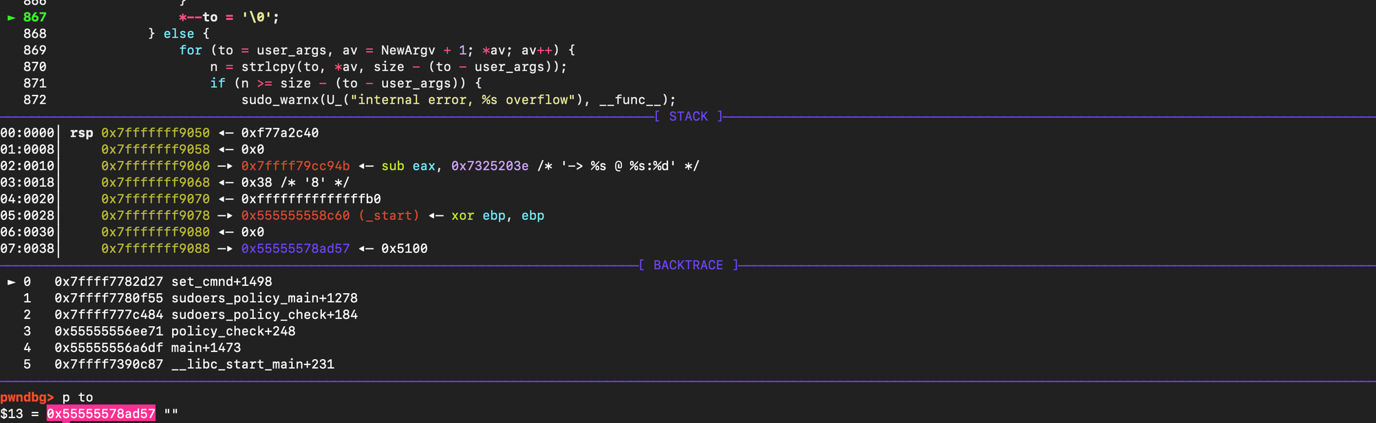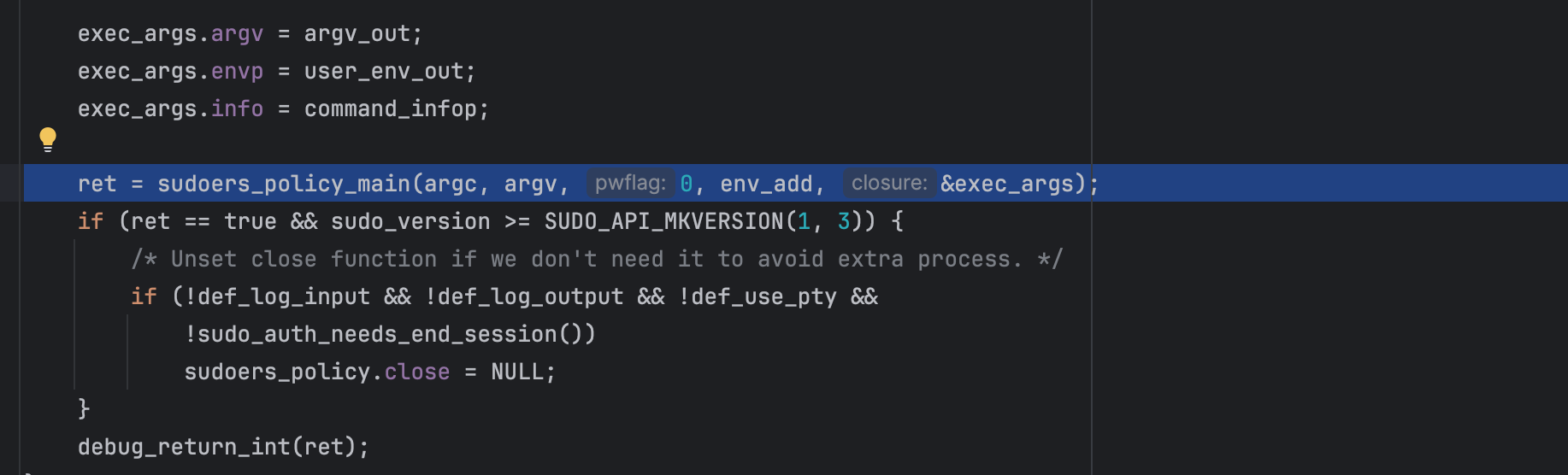 The sudo version I used in this post is 1.8.21, installed it with the following flags CFLAGS='-g -O0' ./configure --prefix=/tmp/sudo-debug --enable-static-sudoers.