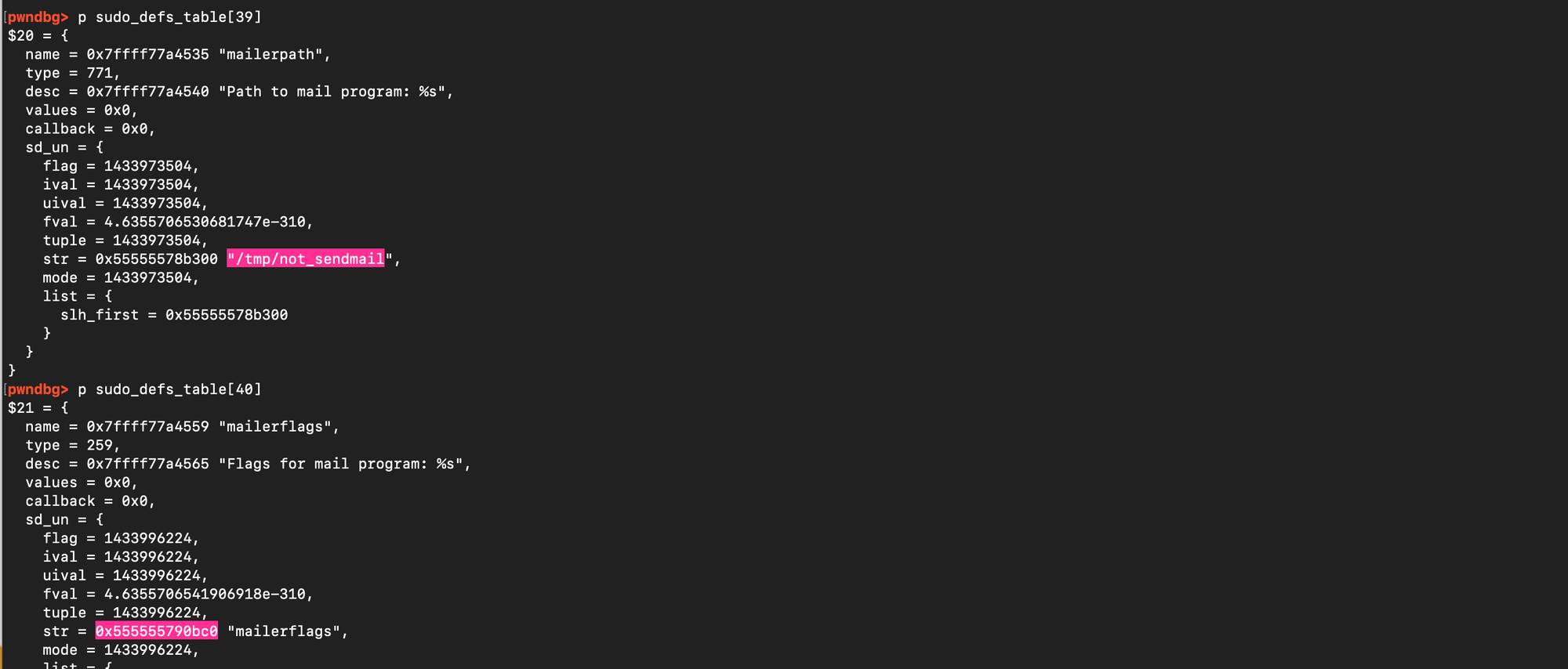 However, there is an easier approach: instead of carefully tuning n andk, one can simply fill the allocated chunk completely and overwrite the last byte with a backslash. This forces the copy loop to continue past the end of the user argument buffer. Due to the way the process memory layout is organized, the next region after the argument vector in memory is the environment array (envp). Thus, the overflow seamlessly continues into env[0] and subsequent environment entries. The gap between the end of the allocated chunk and the start of the target defaults structures can then be padded with garbage data derived from the environment strings, followed immediately by the crafted fake data to corrupt the sudoers defaults structures.