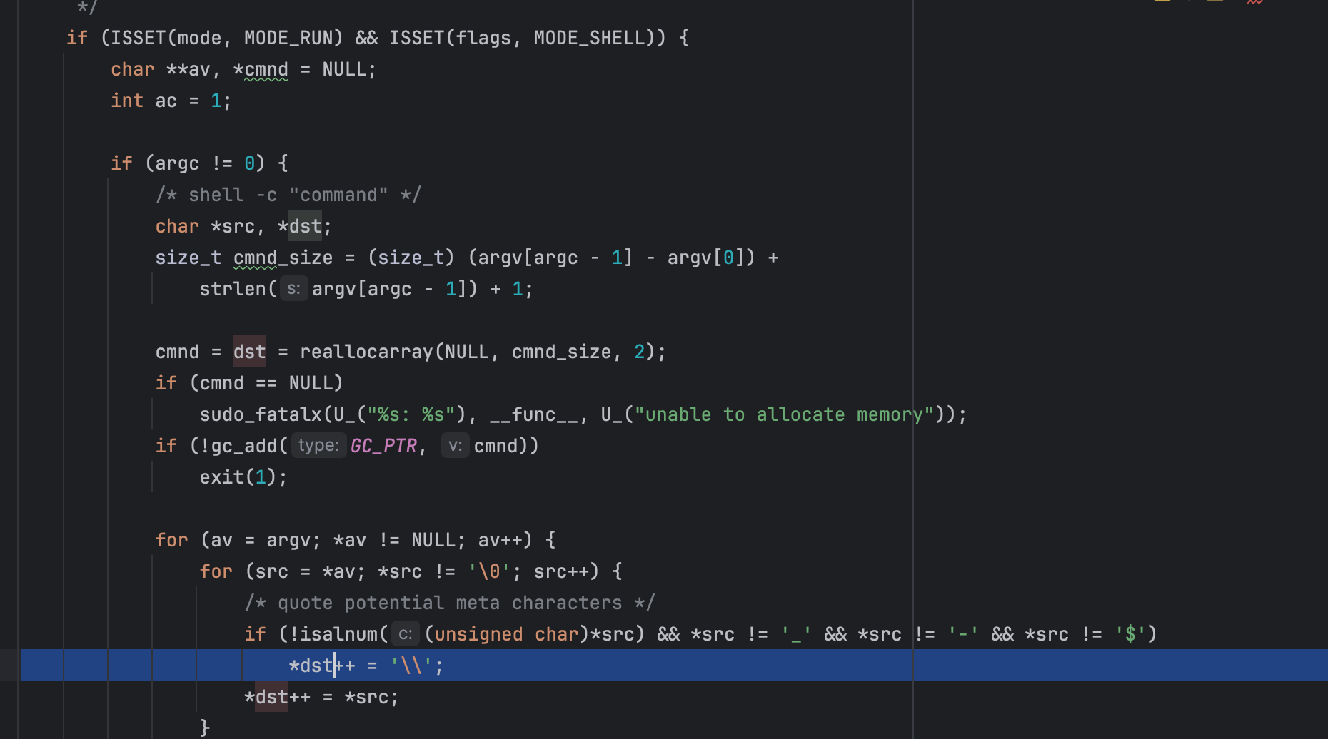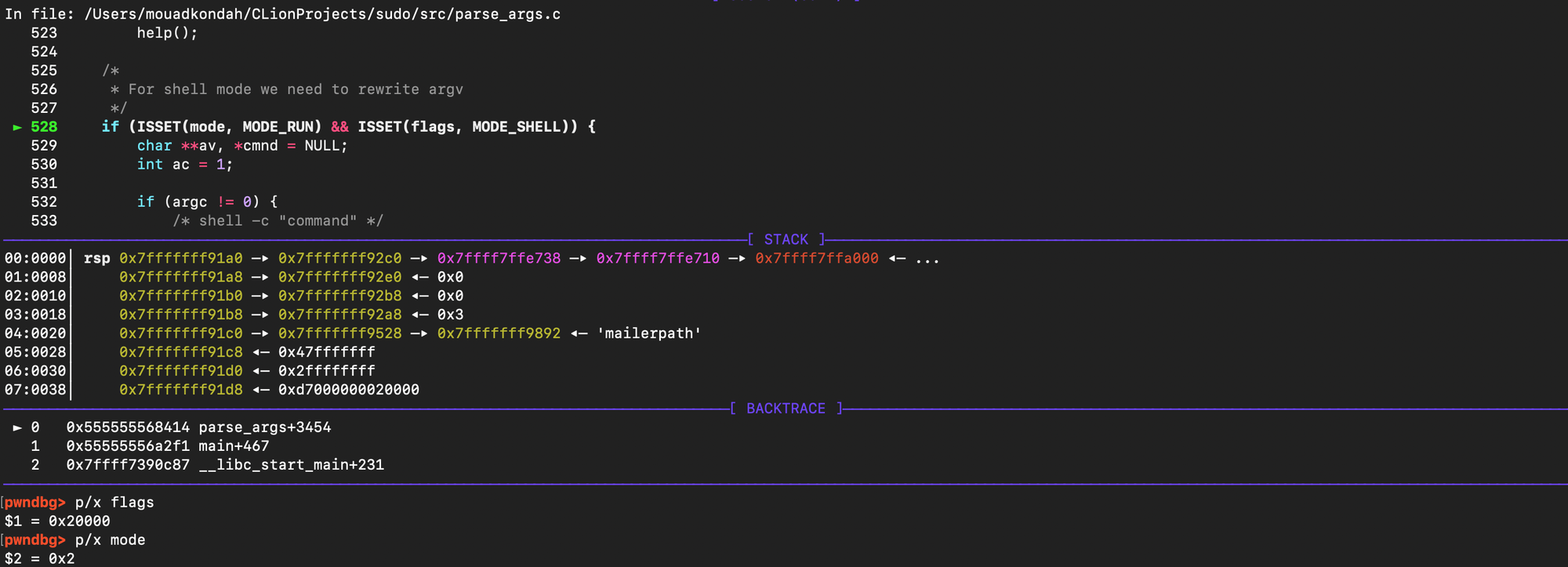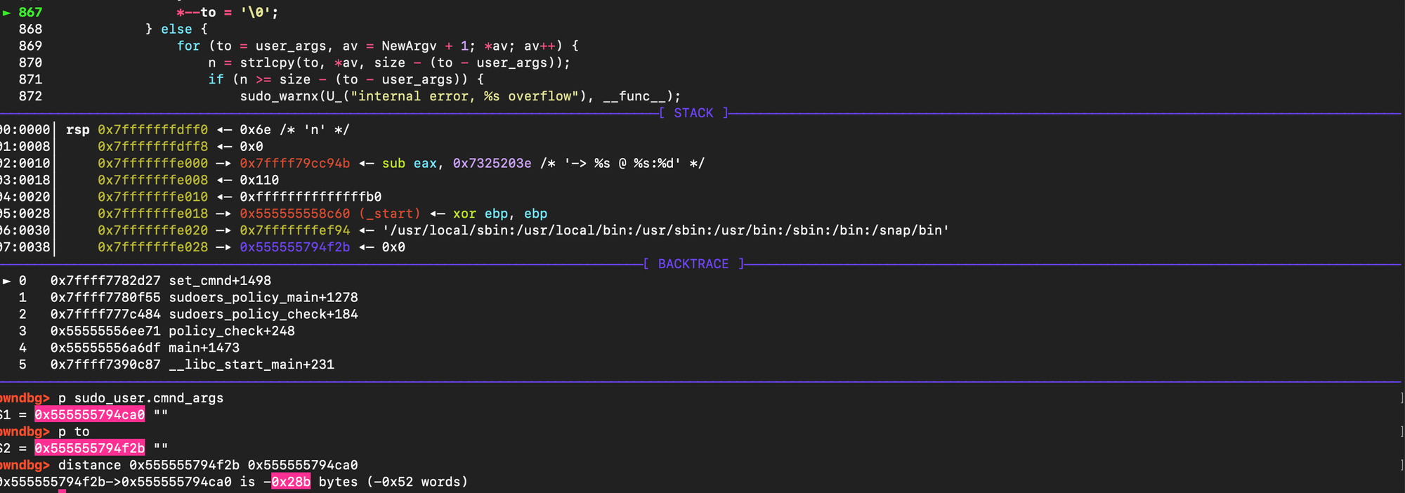 In normal sudo execution, before set_cmnd() is called, arguments go through sanitization (meta-character escaping and other checks). That means the overflow bug inset_cmnd() is not directly triggerable when you run sudo /bin/ls, for example. In the sudoedit path, things are different, the mode is set to MODE_EDIT (0x2), flags contains MODE_SHELL (0x20000), Because of that combination, set_cmnd() still gets invoked but the earlier sanitization step is skipped in this execution mode. This is what Qualys found out in order to reach the vulnerable argument-copying logic through sudoedit, but not through regular sudo and make the bug exploitable through the sudoedit path, where mode = MODE_EDIT (0x2) and flags = MODE_SHELL (0x20000), as the code path bypasses the normal sanitization.
