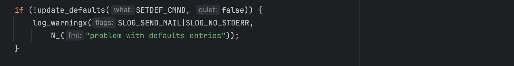 Another requirement comes from set_default(d->var, d->val, d->op, d->file, d->lineno, quiet). If the variable index in the corrupted defaults entry is invalid, the function returns false and triggers a warning which is what drives execution down into log_warningx().
