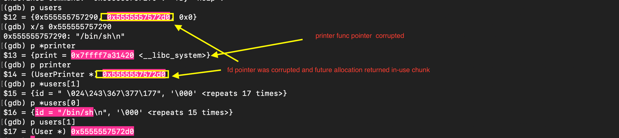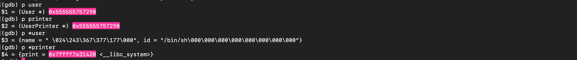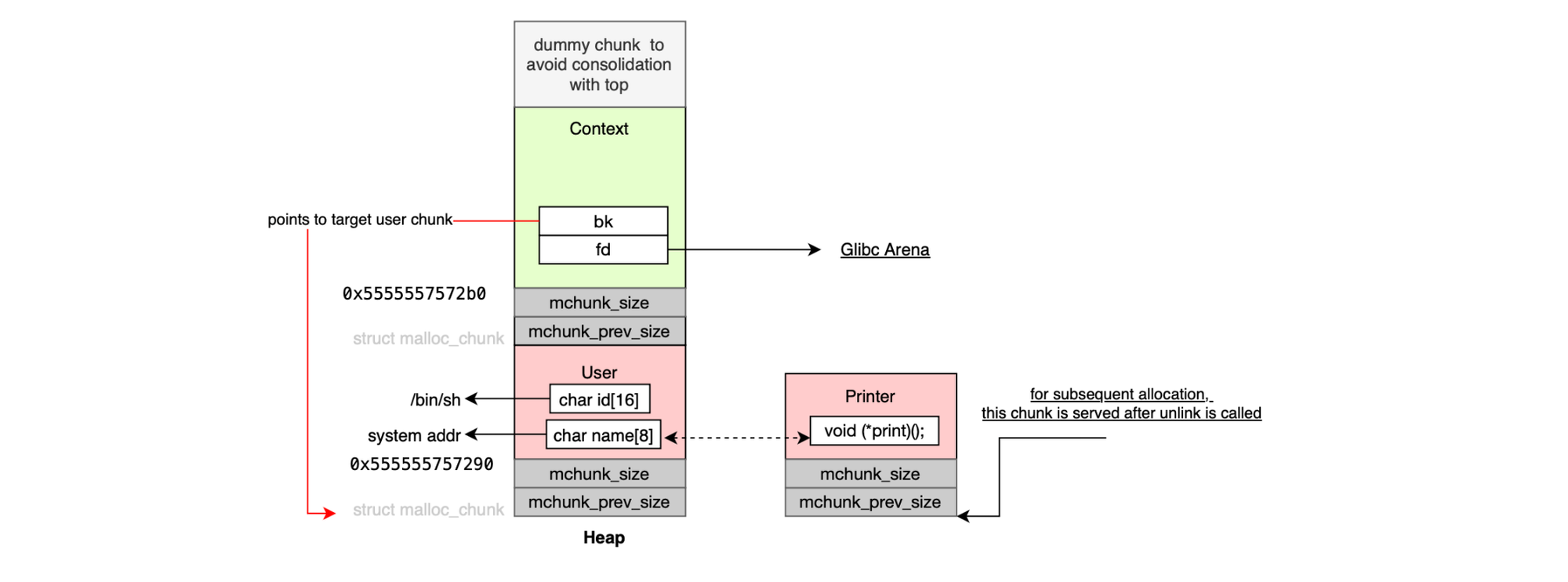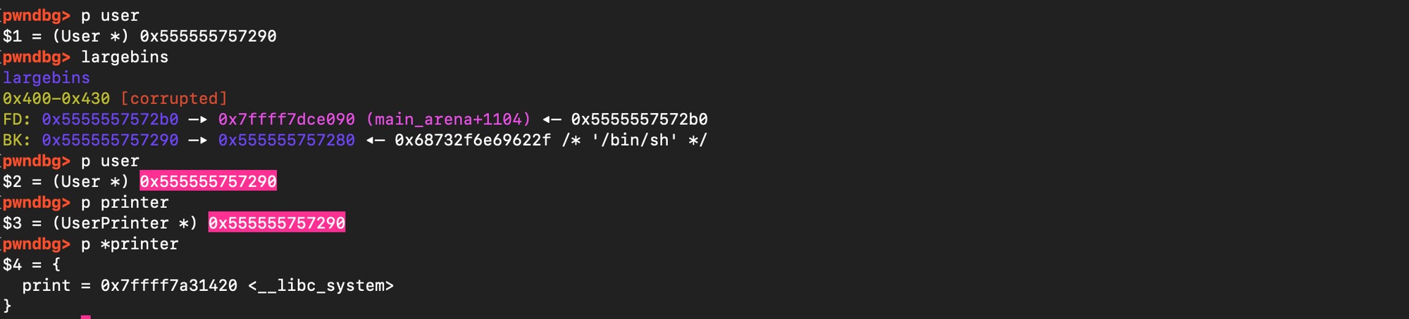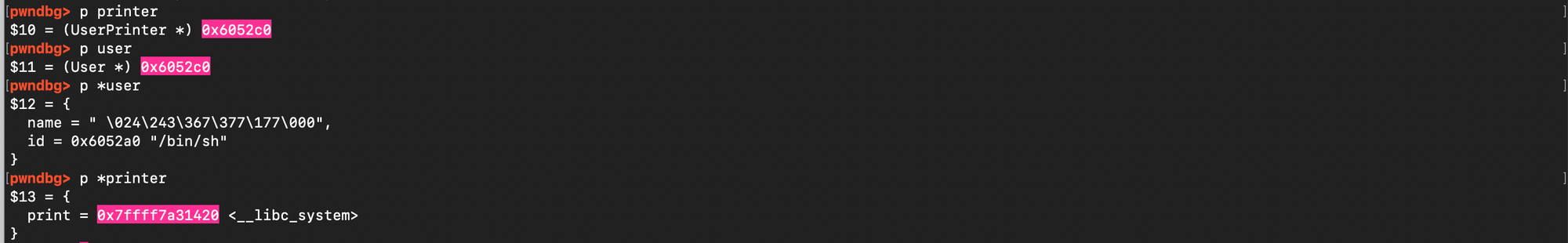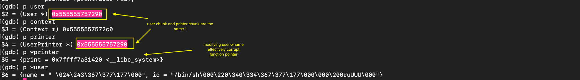 and subsequently overwrite the value stored there with the address of system(). When free(ptr) is later called, it executes system(ptr), and if ptr points to /bin/sh, it results in a shell being spawned.