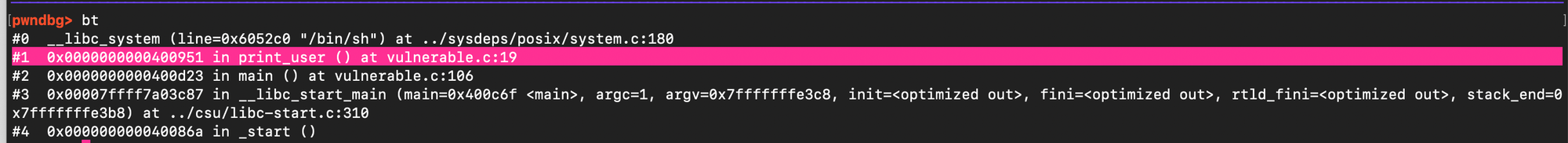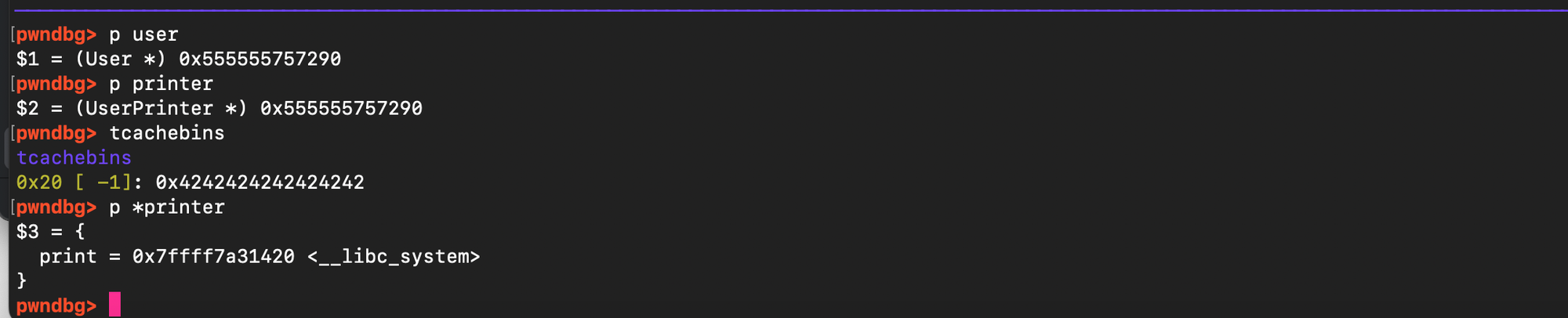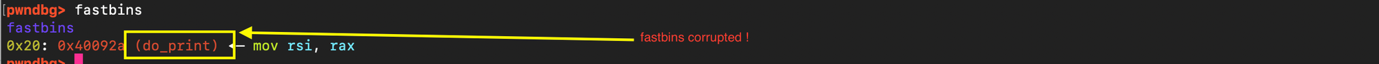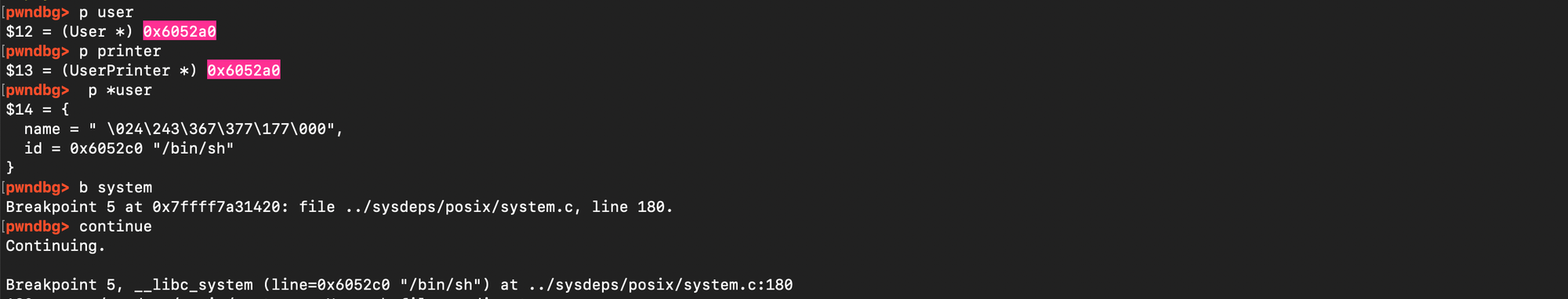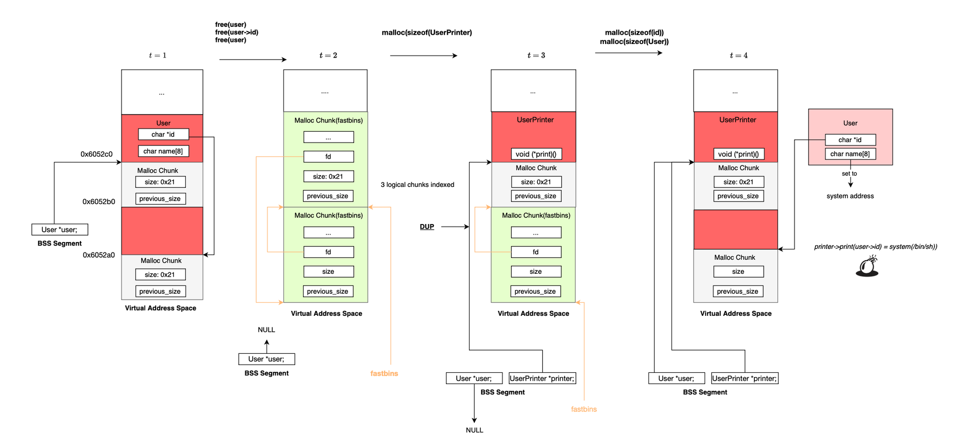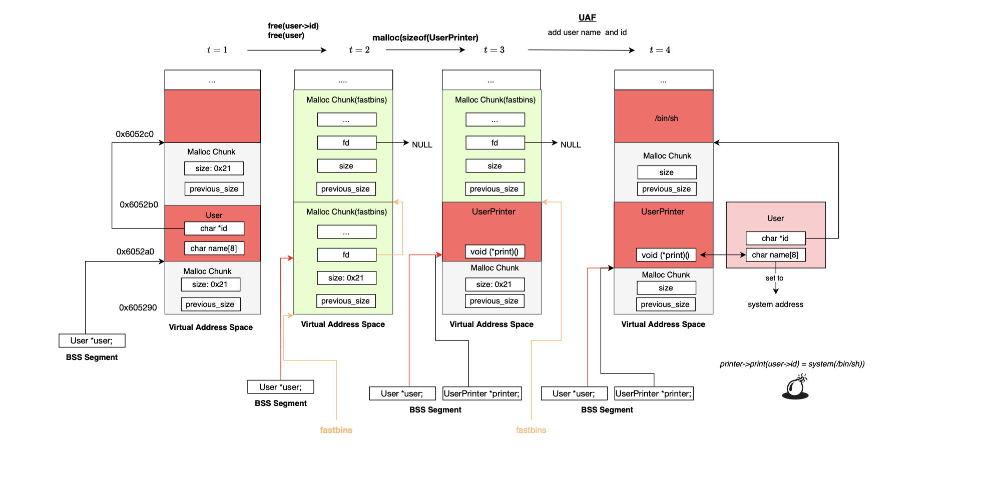 and subsequently overwrite the value stored there with the address of system(). When free(ptr) is later called, it executes system(ptr), and if ptr points to /bin/sh, it results in a shell being spawned.