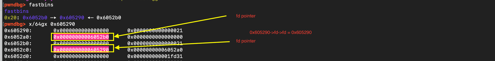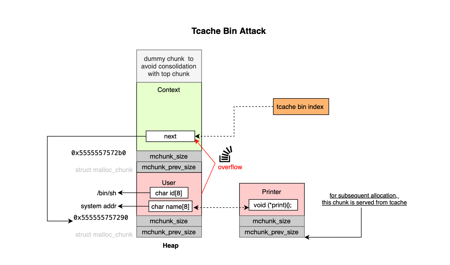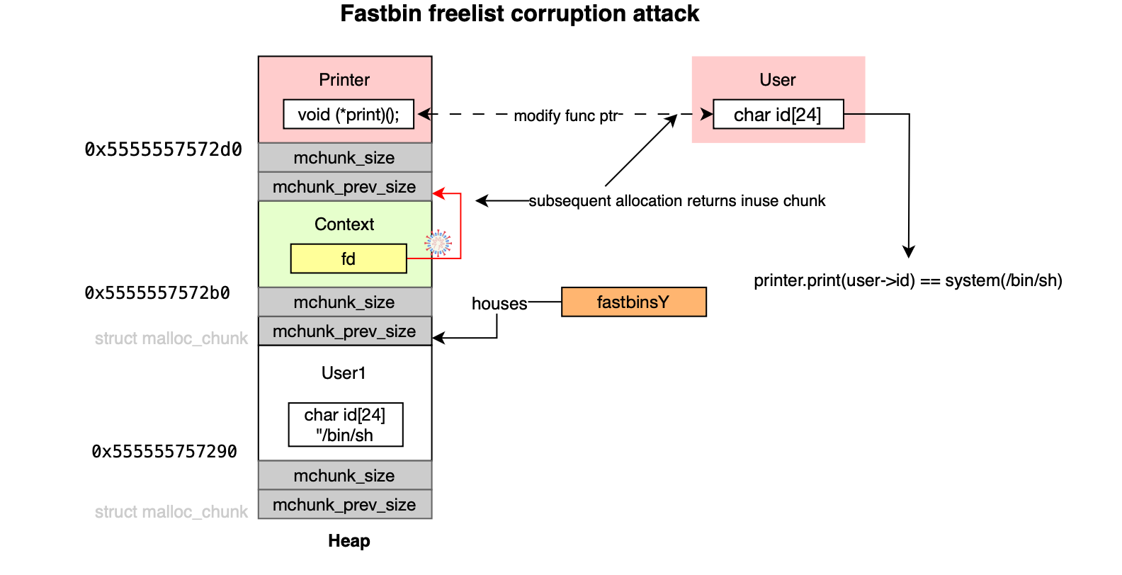 In a fastbin attack, the objective is to exploit a vulnerable heap chunk and corrupt the forward pointer or fd of an adjacent freed indexed malloc chunk. The adversary can then manipulate the fastbin linked list (maintained by the allocator) and influence subsequent allocations.