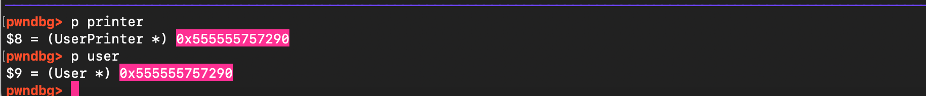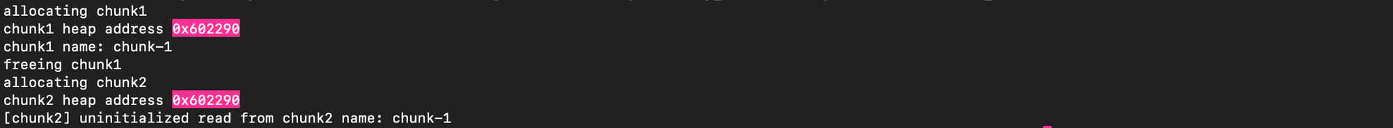 printf("uninitialized read from chunk with name(i.e heap pointer address): %p\n", chunk2->id);