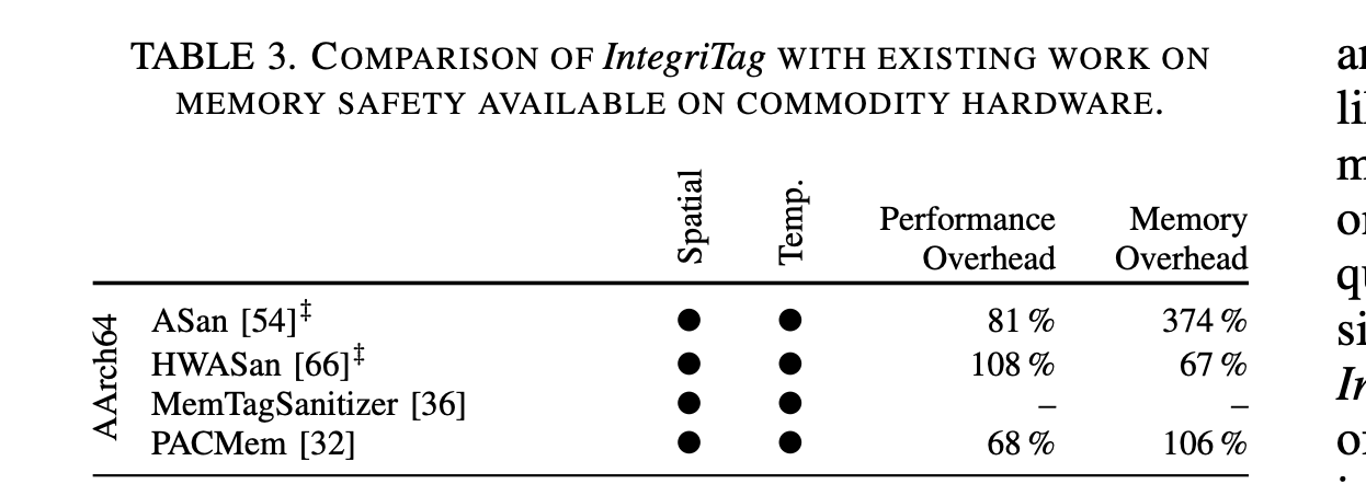 ARM’s Memory Tagging Extension (MTE) provides hardware instructions for tag assignment and checking. LLVM supports two sanitizers: HWASan (Hardware-Assisted AddressSanitizer) and MemTagSanitizer. The former uses TBI to embed tags in pointer high bits but still relies on software to store and check tags, so overhead remains significant. The later uses full hardware support from ARM MTE, with hardware-managed tag memory lowering runtime overhead (intended for both testing and potential production use; heap tagging is not yet fully supported)