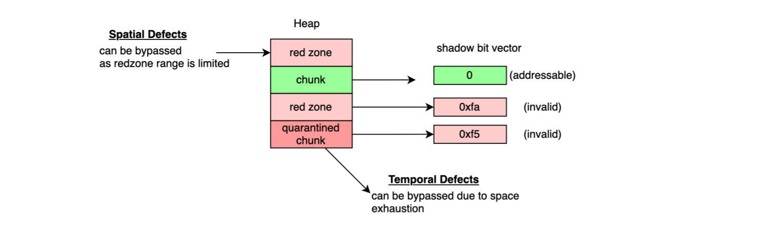 In order to detect spatial memory corruptions, ASan places redzones around allocated memory. When a poisoned byte is read; an error is reported. To cope with temporal defects, freed chunks are moved into a quarantine area. Their shadow bytes are marked as poisoned ( 0xF5) and any access would be catched.