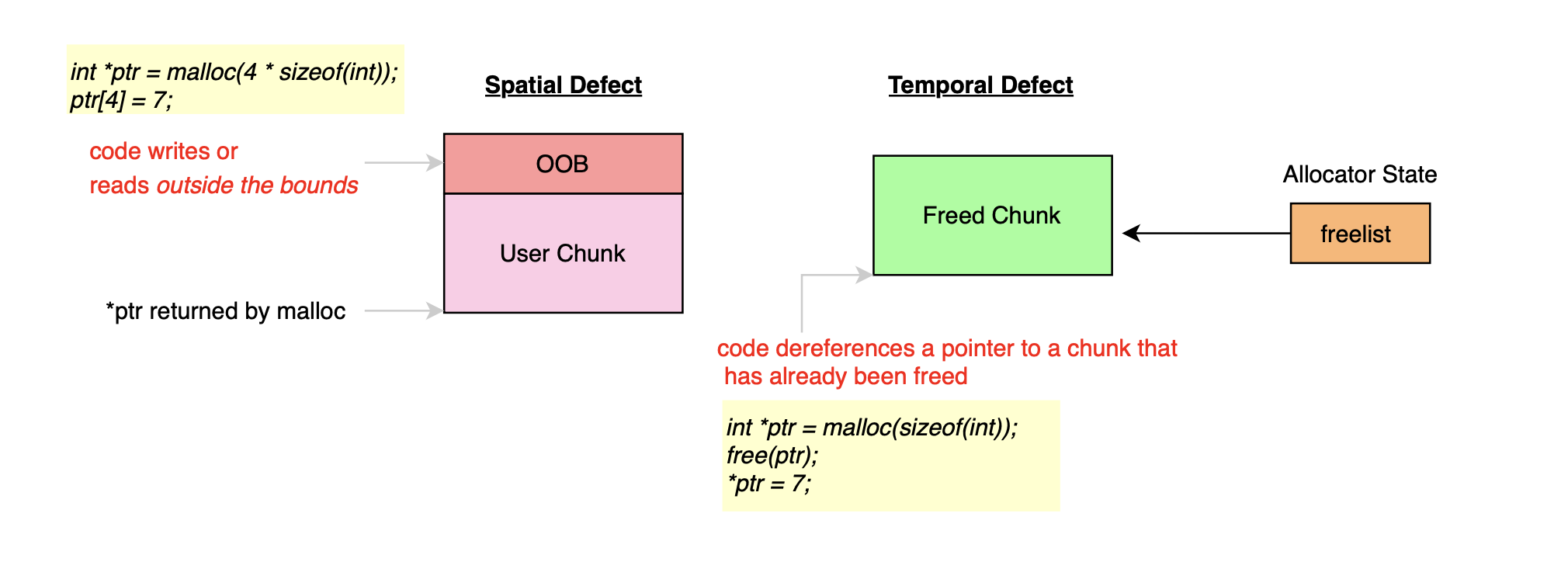However, when applications interface with untrusted input, the exploitability of spatial and temporal memory safety violations or defects (e.g., heap overflows, use-after-free, double free) becomes strongly dependent on the design and robustness of the underlying memory allocator. If the allocator can be easily tricked, then it becomes an attack vector used to corrupt the heap state and achieve arbitrary code execution; for instance the design of the ptmalloc makes it impossible to determine whether a given chunk was originally allocated by malloc or fabricated by an attacker (this is addressed using integrity checks).