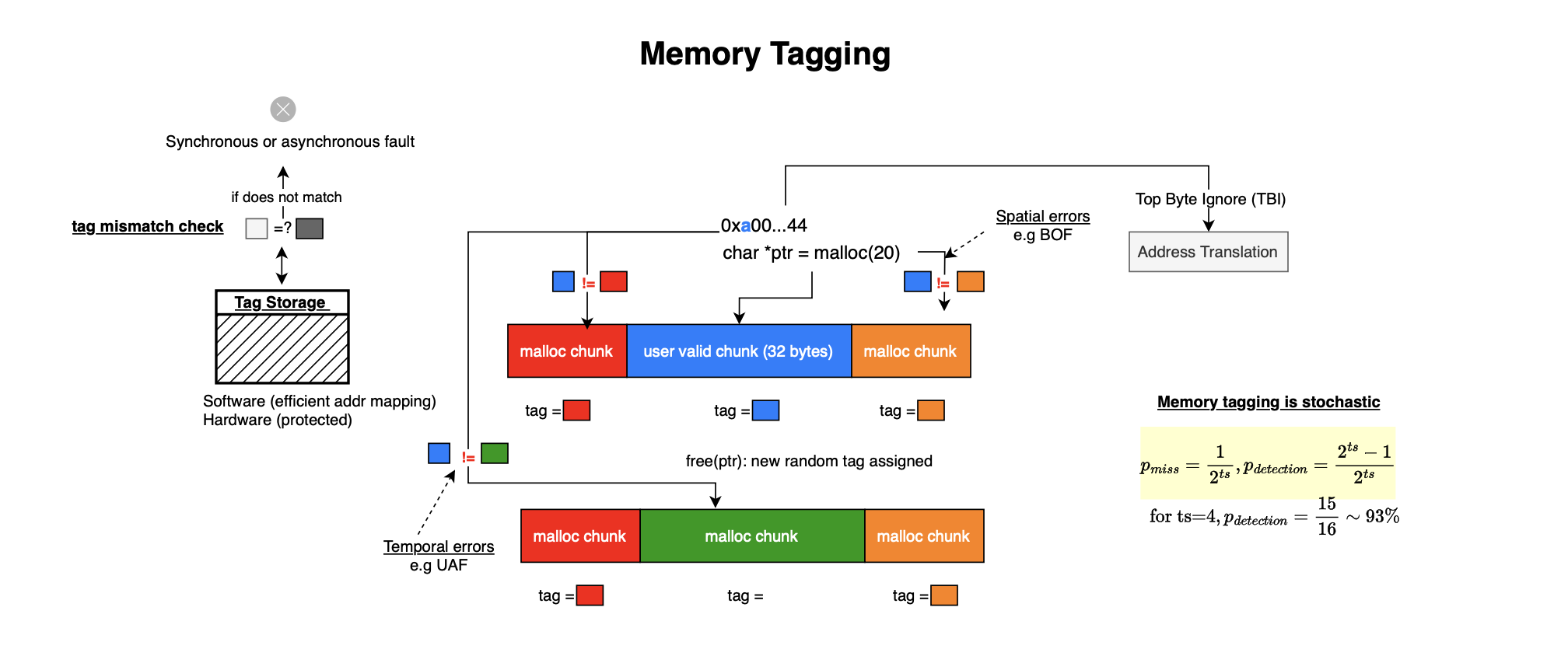 The idea of MTE or memory tagging to assign a tag to each memory allocation and store a corresponding tag in the pointer. On every memory access, the hardware checks whether the pointer’s tag matches the tag of the target memory block. If there is a mismatch, the processor raises a fault. Specifically, out-of-bounds accesses are caught if they land in a block with a mismatched tag, Use-after-free can be detected because freed memory is re-tagged before reuse. With 4-bit tags, there are 16 possible values, with probability 15/16 (93%), the new tag differs and the defect is catched while with probability 1/16 (6%), the defect is not detected. Thus, memory tagging offers probabilistic protection, but at hardware speed and with much lower overhead than software-only sanitizers. Additionally, MTE is not capable of catching overflows within 16 byte granules: