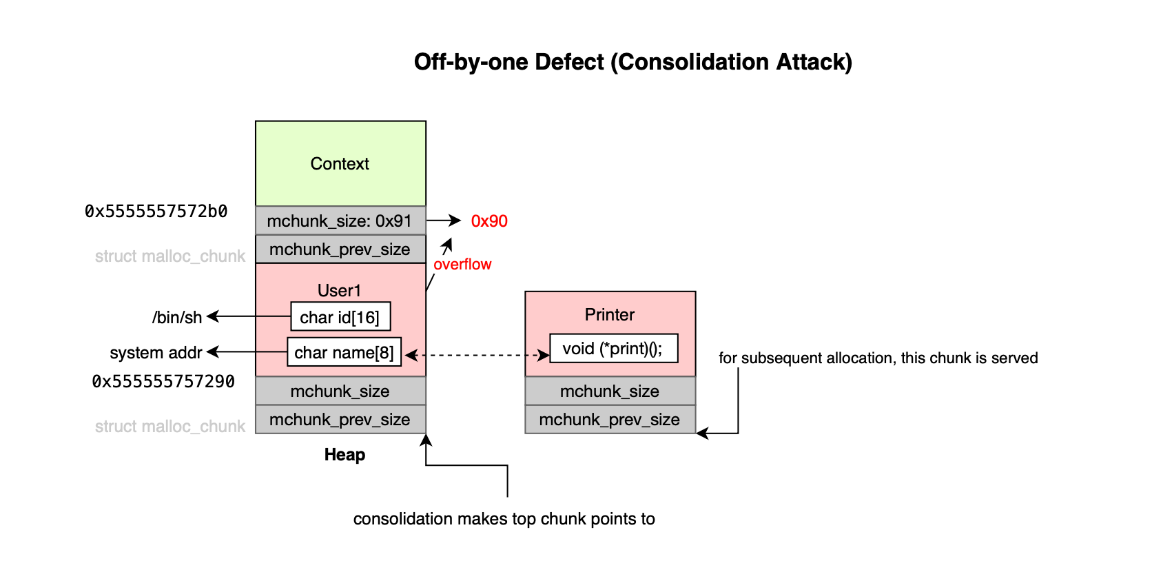 In ptmalloc, the heap is organized into contiguous blocks or chunks of memory. Two adjacent free chunks are coalesced into a larger chunk (cf. consolidation attacks) and maintained in bins implemented as single or double linked lists.