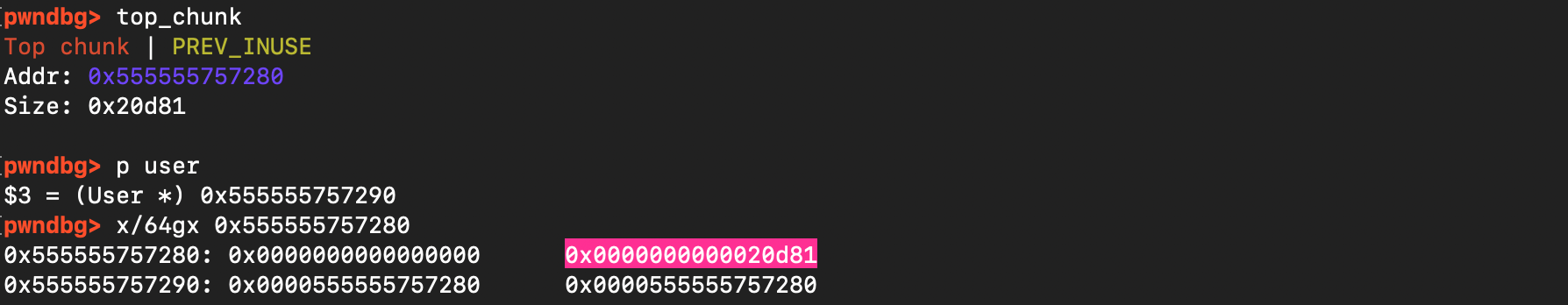 But now there is a problem: even if we consume the entire chunk, there remains a large gap between the end of the allocated user buffer and our intended target. his gap prevents a direct overwrite.