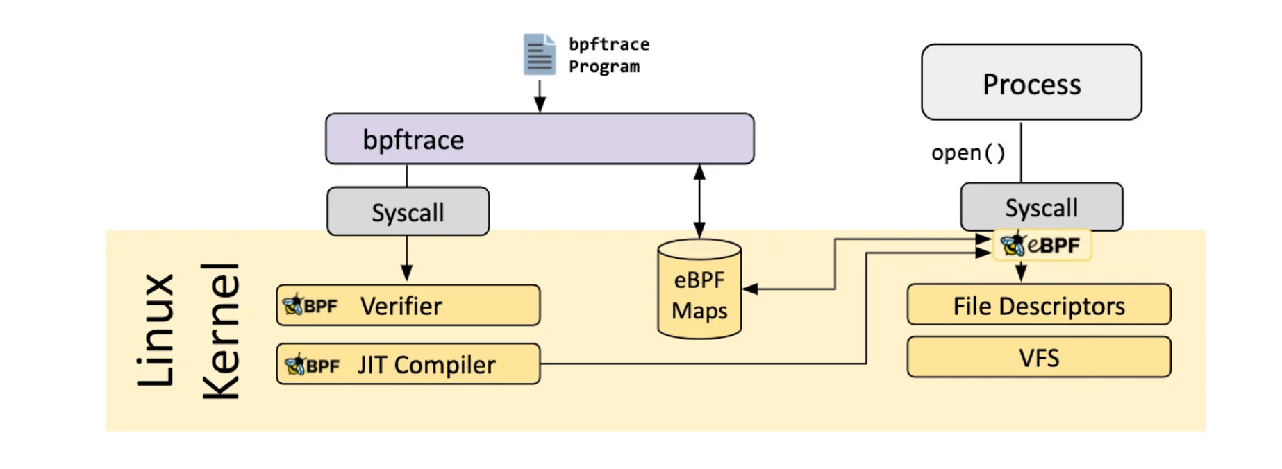 With eBPF, we can execute code in the kernel when the an application or kernel goes through a certain hook point like a function entry/exit or system call, without the need to install any kernel module. You can basically put sensors and react to different events almost everywhere: