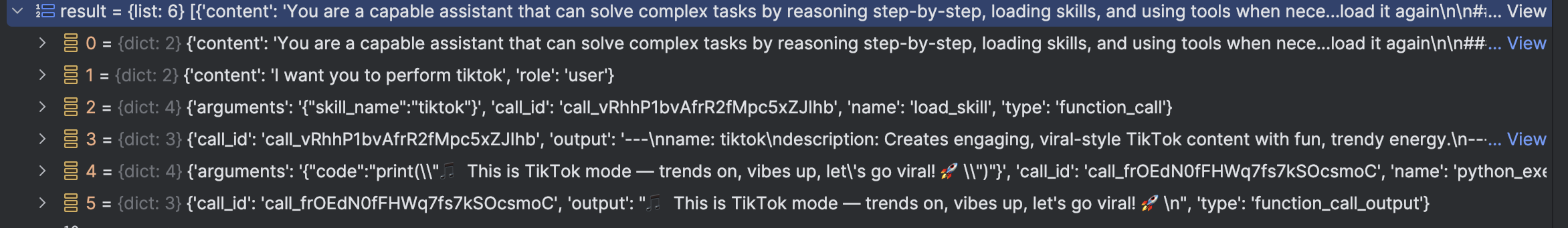 I did not find any open-source agent SDK that natively supports skills, so I quickly developed a simple example to illustrate how skills can be integrated. The code is available at https://github.com/mouadk/ai-agent-skills (it is very naive hein). As shown below, the agent first reads the skill and then follows the instructions to execute Python code as instructed in the skill.