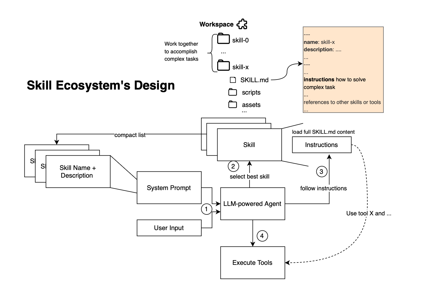)At a high level, the agent operates by identifying relevant skills from metadata, loading the selected skill into the workspace, reading its SKILL.md file, accessing associated resources, and invoking tools to execute the prescribed workflow.