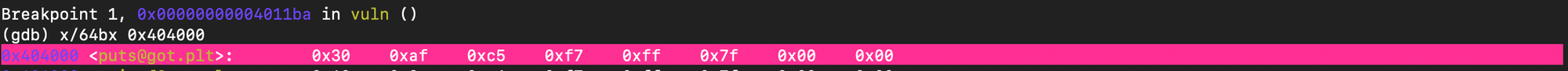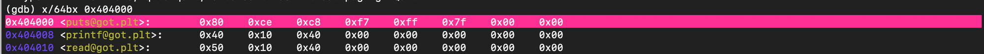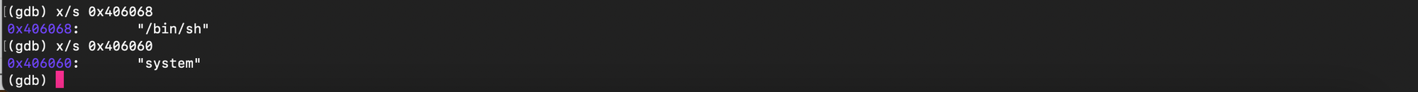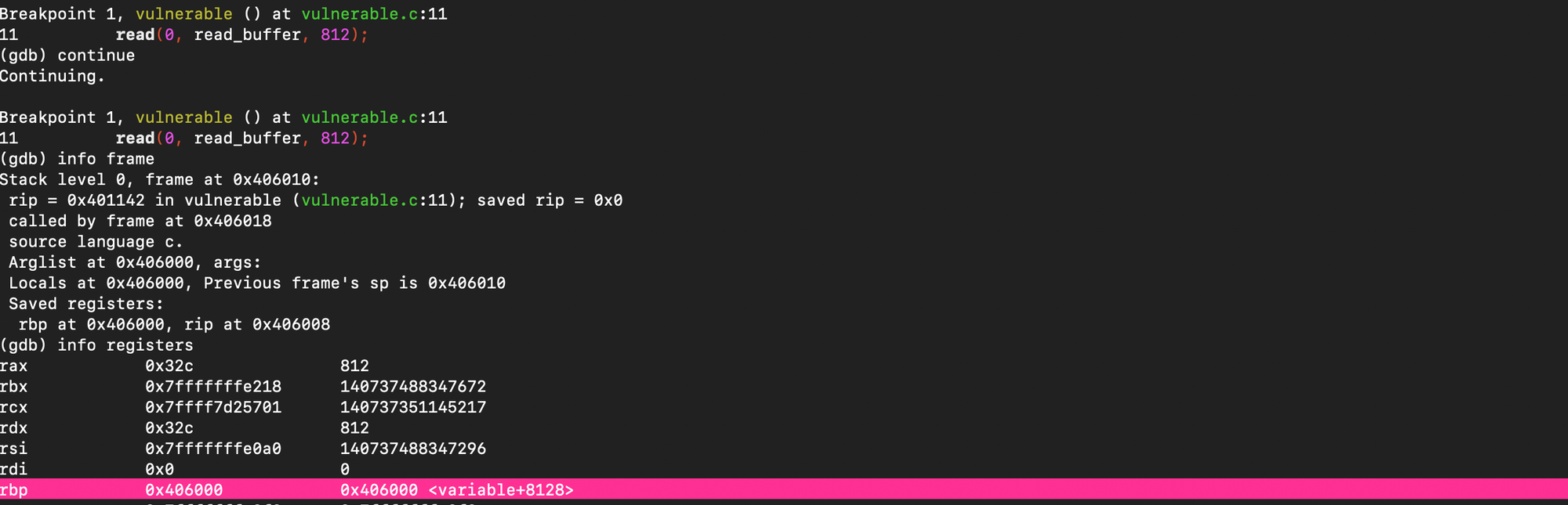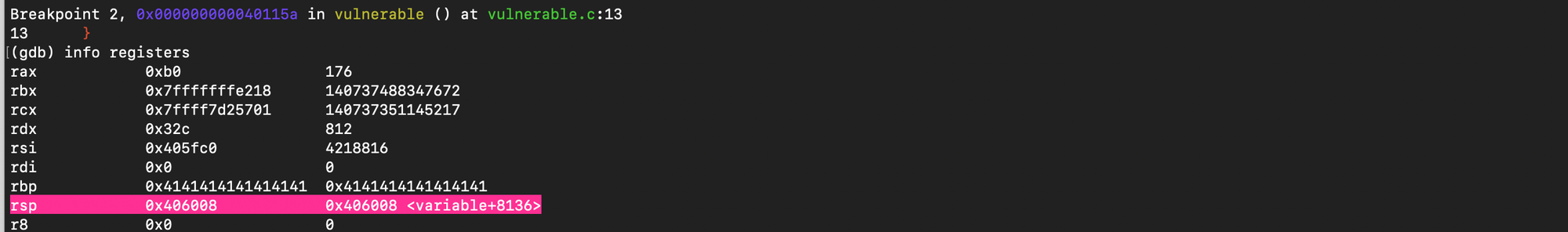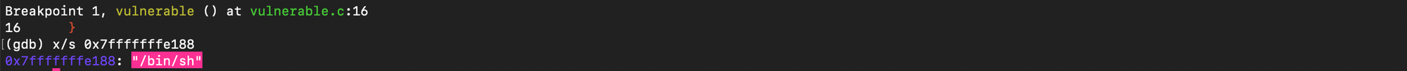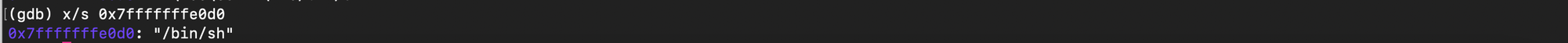 payload += b"/bin/sh\x00"One can inspect the stack at runtime and verify that our data layed out as expected after the read completed: