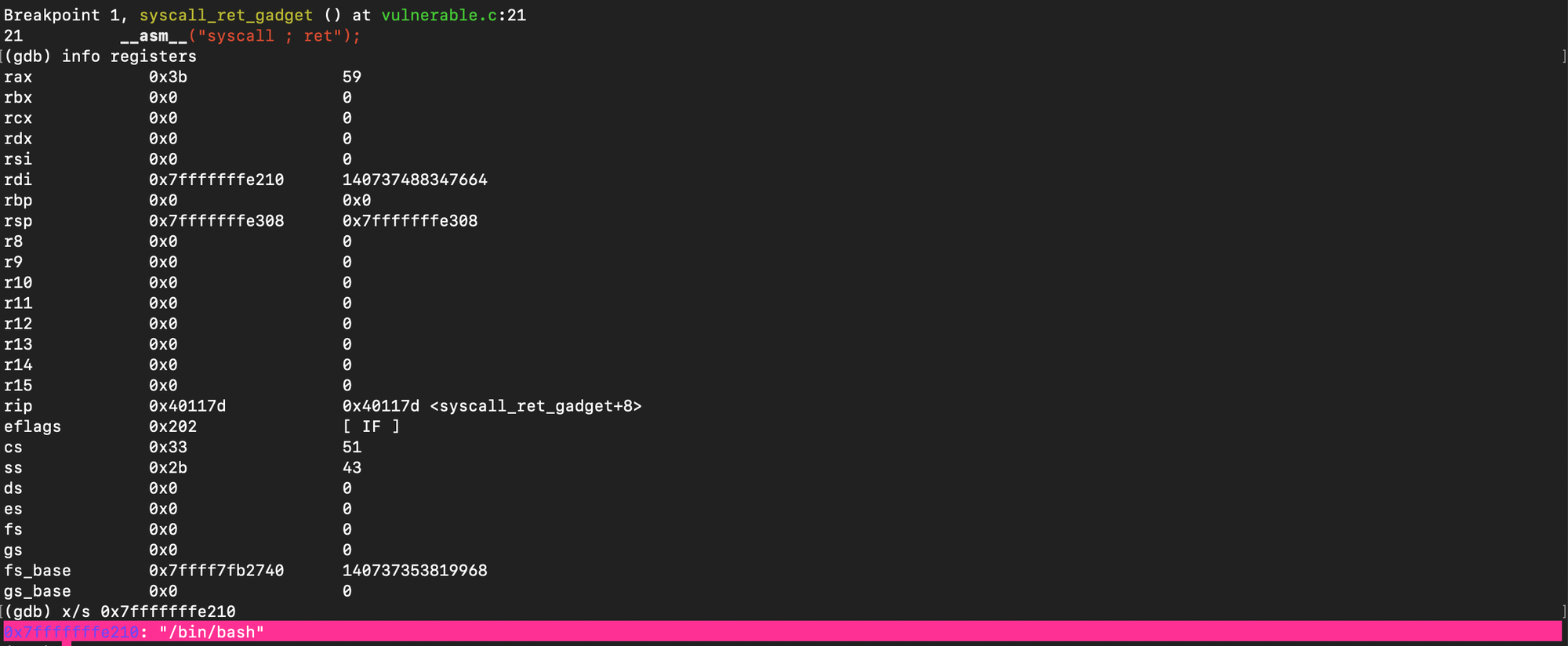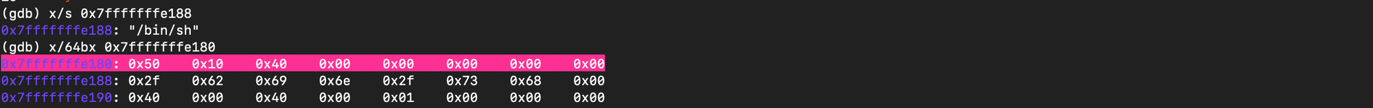 Similarly, the /bin/bash string (0x0068732f6e69622f) was properly placed: