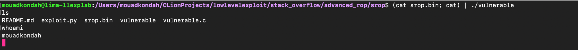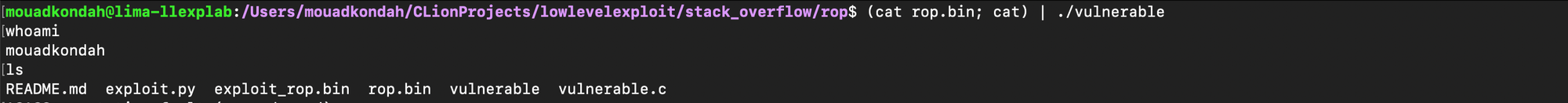 gcc -z execstack -fno-stack-protector -no-pie vulnerable.c -g -o vulnerableSupplying the constructed payload shows that we were able to get a shell: