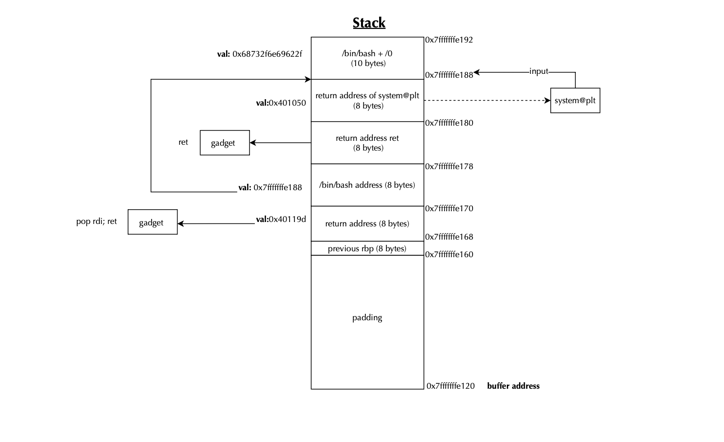 Now suppose the stack is not executable, meaning we cannot place and execute arbitrary shellcode there. Because the return address is pushed on the stack, any overflow could be exploited to overwrite the return address and chain gadgets to achieve arbitrary code execution i.e instead of pointing to our shellcode housing all instructions, we use whatever gadgets available to complete the same task. Assuming ASLR/PIE is disabled, we can overwrite the first return address to point to a gadget that populates the rdiregister (e.g., pop rdi; ret), and then provide a second return address that jumps to system@plt, this is illustrated below: