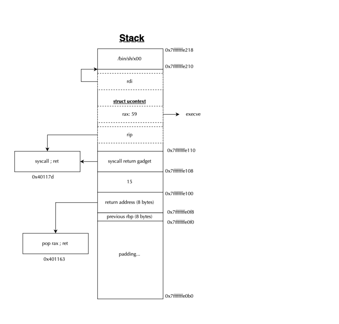 SROP exploits the fact that, when delivering a signal, the kernel saves the process's state (registers, instruction pointer, etc.) on the user-space stack without maintaining kernel-side bookkeeping. As a result, the kernel cannot easily verify whether a sigreturn call is legitimate. This lack of validation enables attackers to craft a fake signal frame on the stack and use the sigreturn syscall to restore an arbitrary, attacker-controlled hardware state. Simply stated, SROP tricks the kernel into thinking a signal handler has just finished, instructing it to restore a maliciously constructed context effectively hijacking the control flow.
