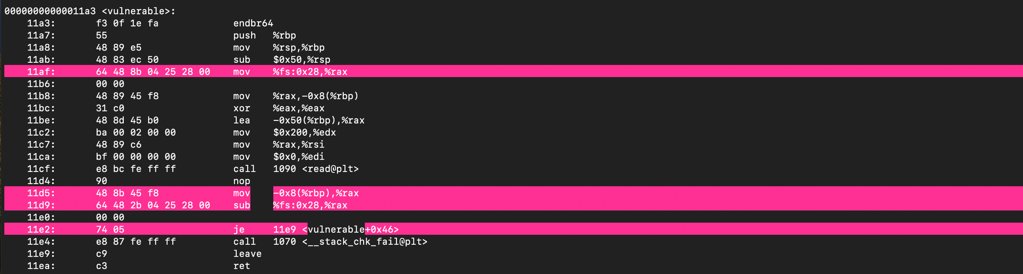 The compiler typically emits code to fetch the canary with mov %fs:0x28, %rax, push it onto the stack ( mov %rax, -0x8(%rbp)), later, before returning, compare the current value to the original, if it doesn't match, the program calls __stack_chk_fail@plt, which aborts the process. Of course if the attacker possesses the canary value (e.g due to memory leak bugs like format string vulnerabilities), it can be defeated.