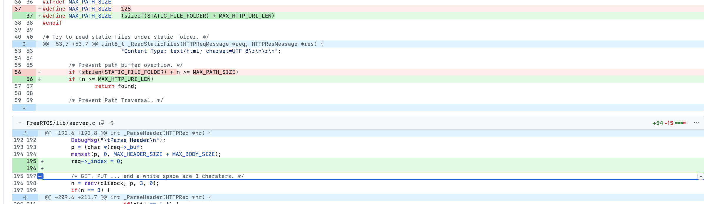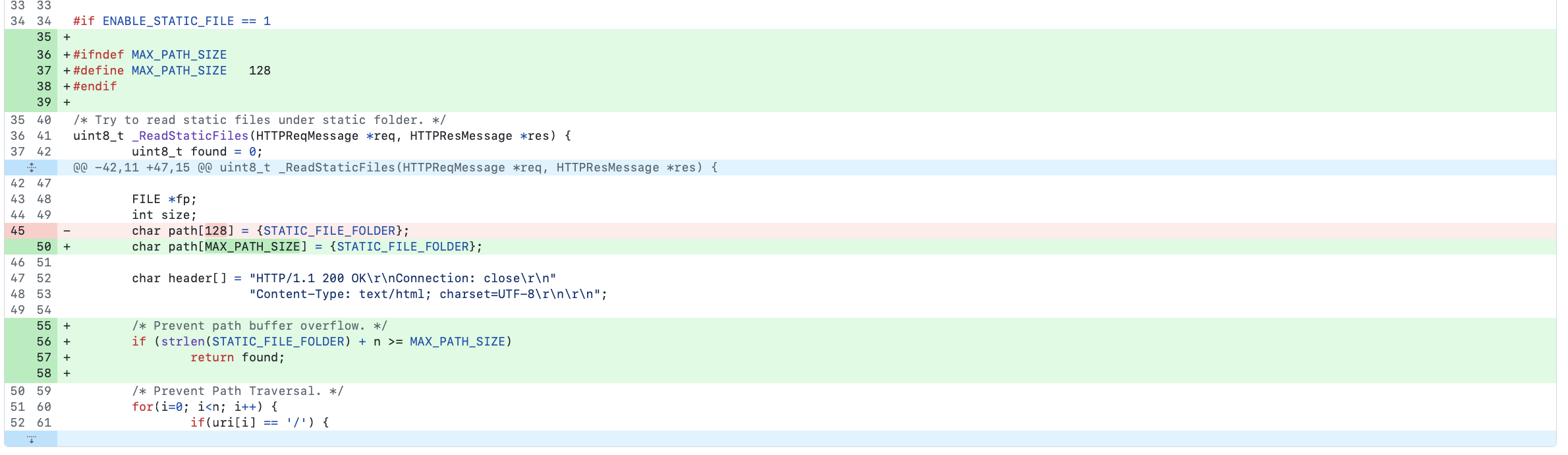 if (strlen(STATIC_FILE_FOLDER) + strlen(uri) < sizeof(path)) { ... }is insufficient, as it is vulnerable to integer overflow. Therefore, the fix must be implemented with caution. The fix implemented by the maintainers consisted of introducing max file path size variable and checking that (strlen(STATIC_FILE_FOLDER) + strlen(ui) >= MAX_PATH_SIZE), this is not enough as integer overflow could still exit; for example, if strlen(STATIC_FILE_FOLDER) is 10 and strlen(ui) = SIZE_MAX - 5, then the result will wrap to a small value, making the check incorrectly pass.