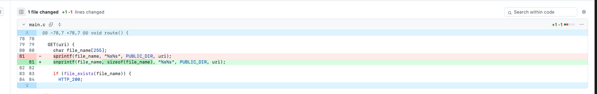 Here, sprintf combines PUBLIC_DIR and uri into a fixed-size stack buffer. Since sprintf continues writing until a null terminator is found, an attacker could exploit this with: