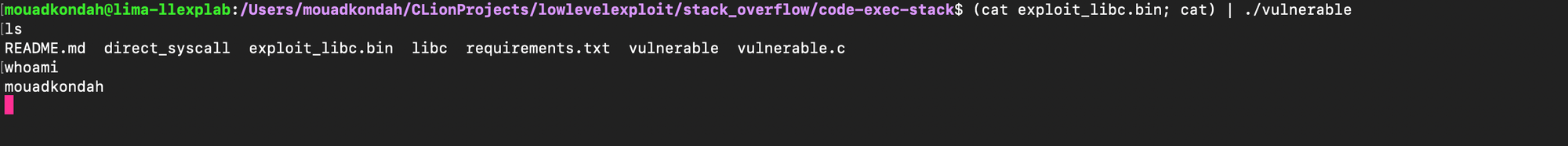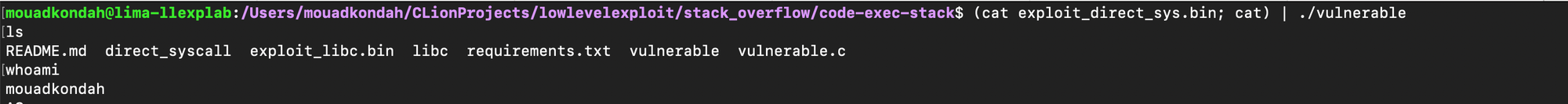 So far, we've explored two ways to execute code on the stack. The first uses direct system calls, which requires knowing the syscall number and setting up the appropriate registers. The second method invokes the system library function. In the following sections, we’ll demonstrate how to achieve similar results using Return-Oriented Programming (ROP) without executing code on the stack which is often prohibited by modern protections.