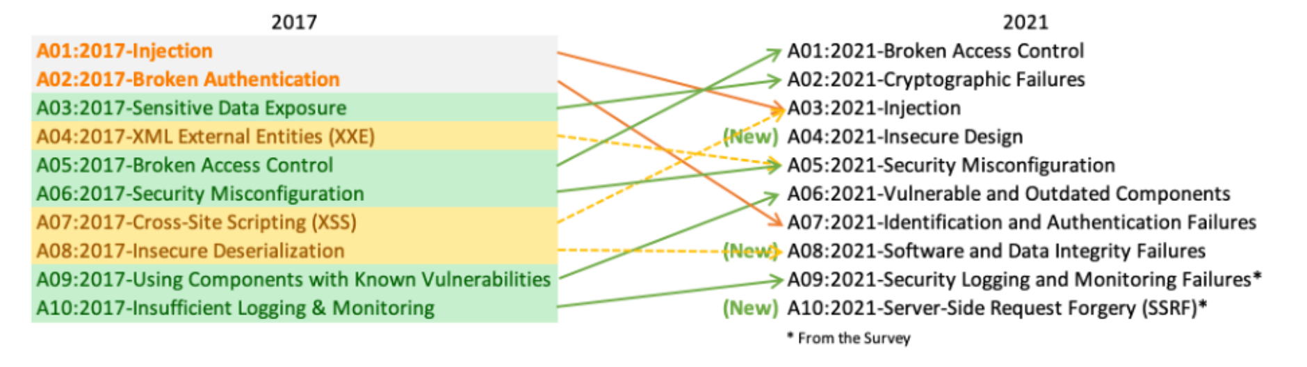 Before diving into low level vulnerabilities, let's briefly discuss the OWASP Top 10 web security risks. It's useful to contrast high level vulnerabilities such as injection flaws, where user-controlled input is interpreted as code and can lead to remote code execution (e.g., expression injection), with low-level issues like buffer overflows or use-after-free defects, which arise from improper memory management. We refer to the OWASP 2021 version as baseline (the 2025 update is expected soon).