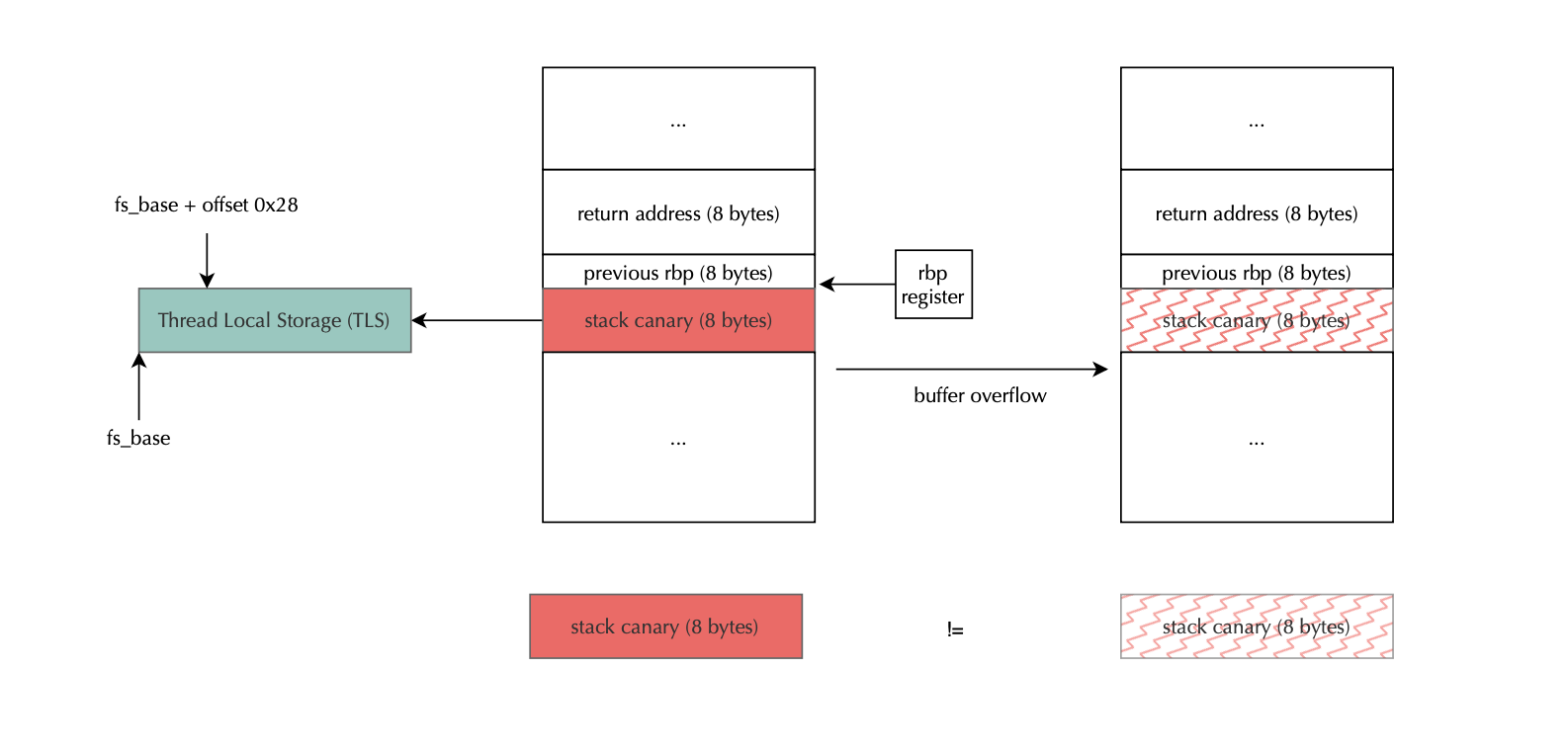 Before returning from a function, the program checks whether the canary value has been altered. If it has, that likely indicates a stack smashing attack, and the program aborts to prevent exploitation. To support multi-threading, the compiler stores the canary in Thread Control Block (TCB), so that each thread has a separate random value. The canary is accessed using the fs segment register on x86_64 Linux systems.