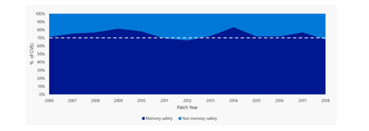 Similarly, Microsoft estimated that 70% of the security vulnerabilities they fix annually are memory safety issues (despite mitigations including intense code review, training, static analysis, and more).