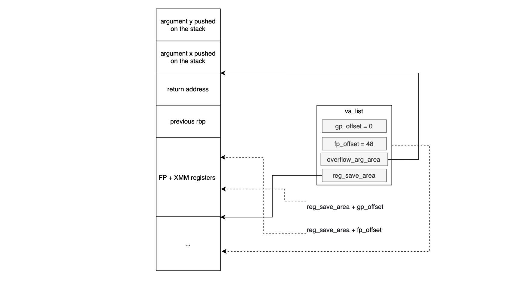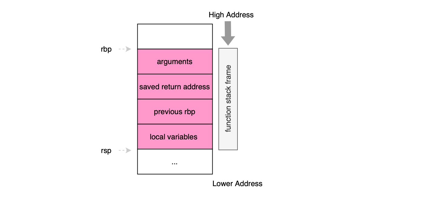 The stack grows from higher memory addresses toward lower ones. Each time a function is called, the hardware cpu creates a new stack frame, bounded by the rbp (base pointer) and rsp (stack pointer) registers. The figure below illustrates the layout of a typical x86-64 function stack frame.