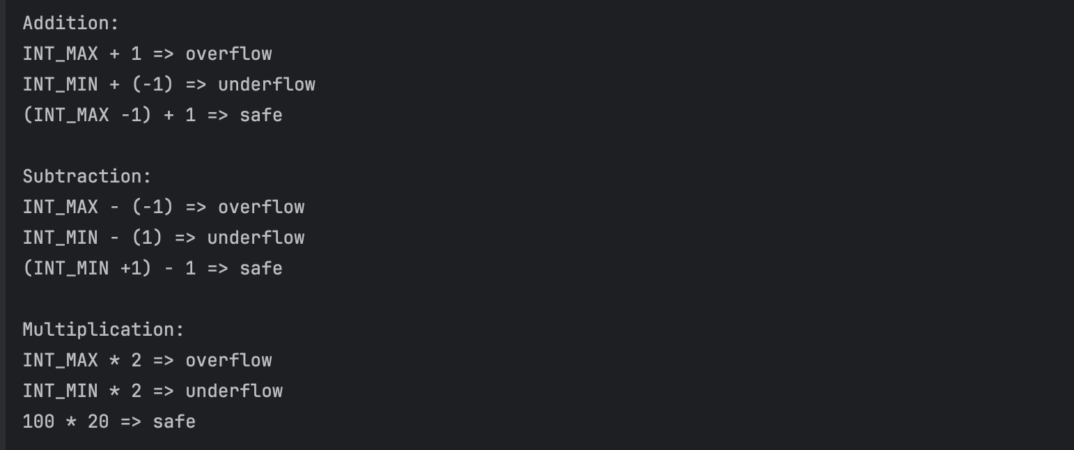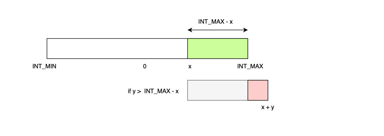 }More generally, if we consider two integers x and y, the overflow or underflow of x+y can be detected as follows (recall that \(x,y \leq INT\_MAX\)), \( \text{if } (x > 0 \text{ and } y > (INT\_MAX - x)) \) then integer overflow, \( \text{ else if } (x< 0) \text{ and } (y < INT\_MIN− x) \) then integer underflow, else OK.